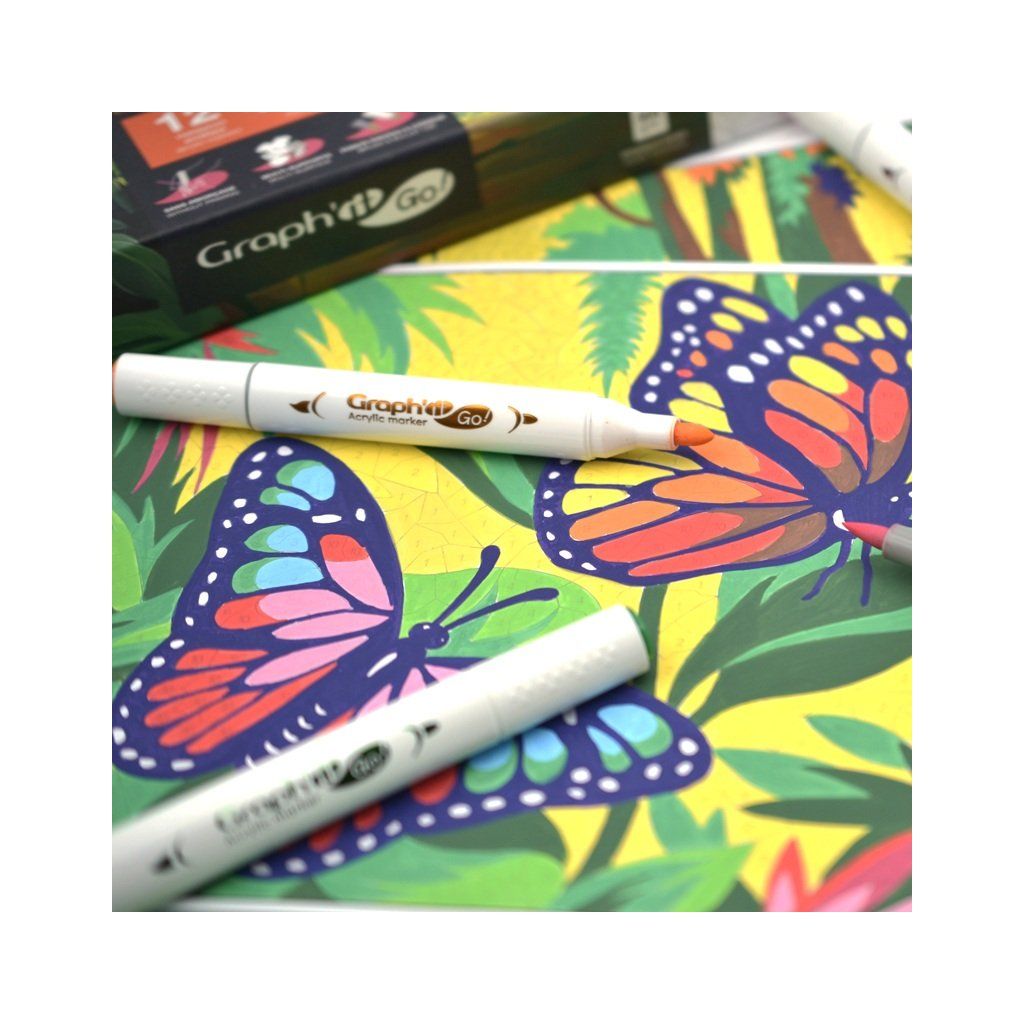 Obojstranné akrylové fixy GRAPH'IT GO! s kvalitnými japonskými polyesterovými hrotmi. Na jednej strane má mäkký štetcový hrot a na druhej strane pevný guľatý hrot. Je ideálny pre všetkých milovníkov voľnočasových kresieb, tajomného vyfarbovania alebo kreatívnych túžob. Univerzálne použitie na drevo, sklo, kameň, kov, papier a ďalšie. Jeho pigmentovaný atrament na vodnej báze je nepriehľadný, ale nepresakuje papierom.