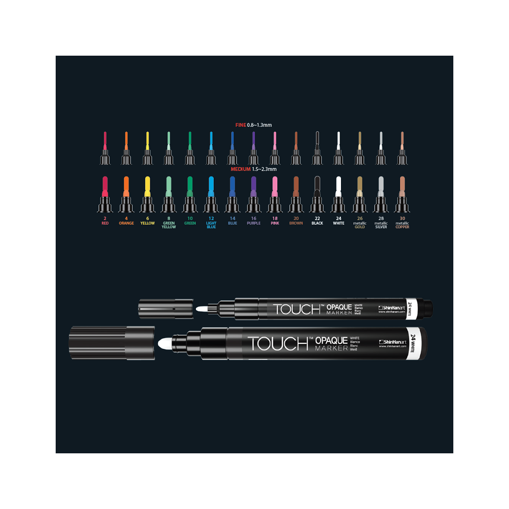 Atramentové pigmentové popisovače značky TOUCH na vodnej báze sú vynikajúcim kreatívnym nástrojom pre veľmi odolné a živé vyfarbenie detailov. 100% čistý pigmentový atrament je mimoriadne bohatý na pigmenty a jeho jedinečné zloženie atramentu na vodnej báze zaručuje neporovnateľne žiarivé krycie farby so silnou svetlostálosťou, ktoré vyniknú na svetlých aj tmavých povrchoch a ponúkajú neobmedzené možnosti. Všestranný TOUCH Opaque Marker je možné použiť prakticky na všetky povrchy ako je papier, drevo, plast, kov, sklo, guma, polystyrén, látka, koža, keramika a mnoho ďalších. Či už je povrch svetlý alebo tmavý, drsný alebo hladký, aj tak je veľmi odolný voči vode a vyblednutiu na vnútorné aj vonkajšie použitie. Na väčšine hladkých, neporéznych materiáloch ako je sklo, PVC a kovové povrchy je ľahko snímateľný.