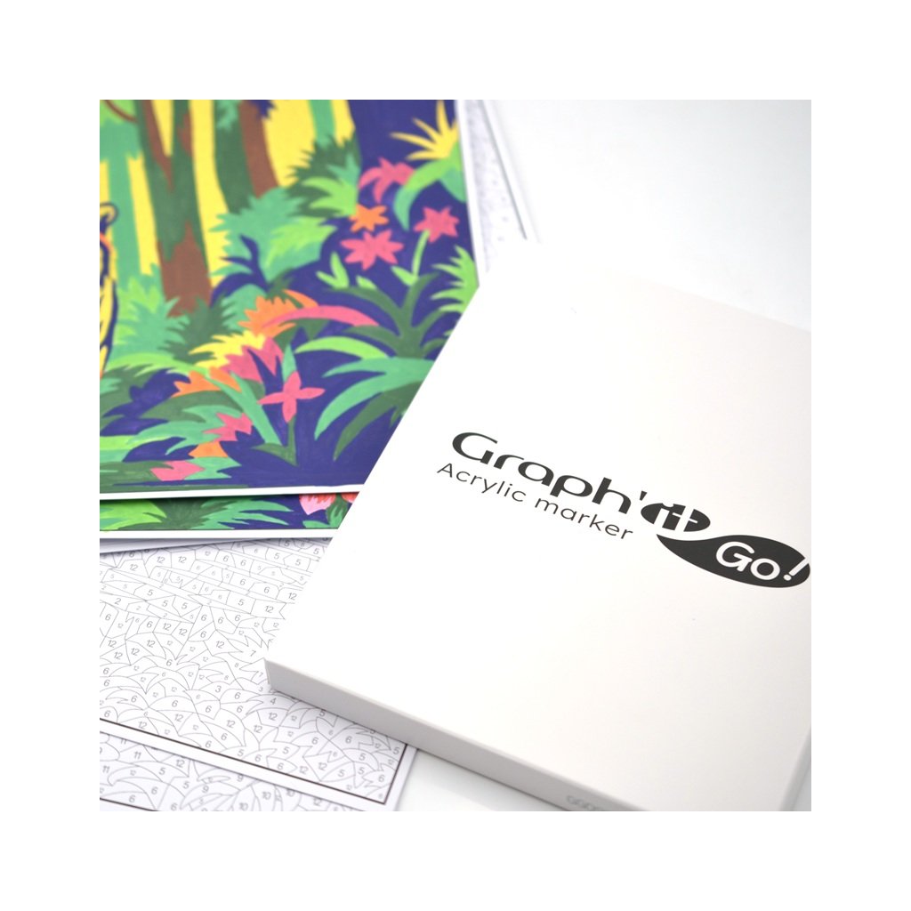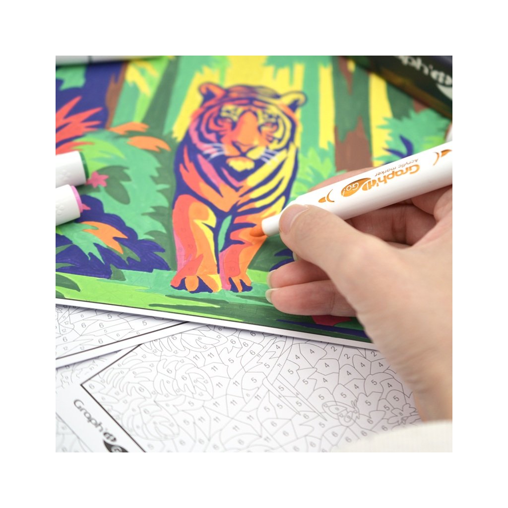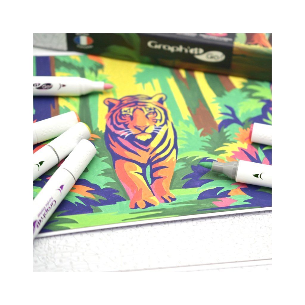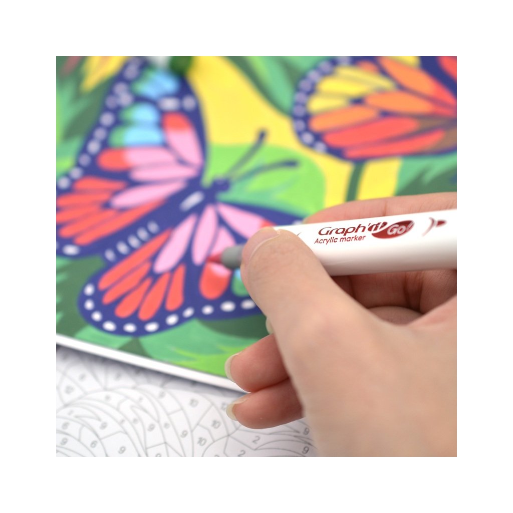 Obojstranné akrylové fixy GRAPH'IT GO! s kvalitnými japonskými polyesterovými hrotmi. Na jednej strane má mäkký štetcový hrot a na druhej strane pevný guľatý hrot. Je ideálny pre všetkých milovníkov voľnočasových kresieb, tajomného vyfarbovania alebo kreatívnych túžob. Univerzálne použitie na drevo, sklo, kameň, kov, papier a ďalšie. Jeho pigmentovaný atrament na vodnej báze je nepriehľadný, ale nepresakuje papierom.