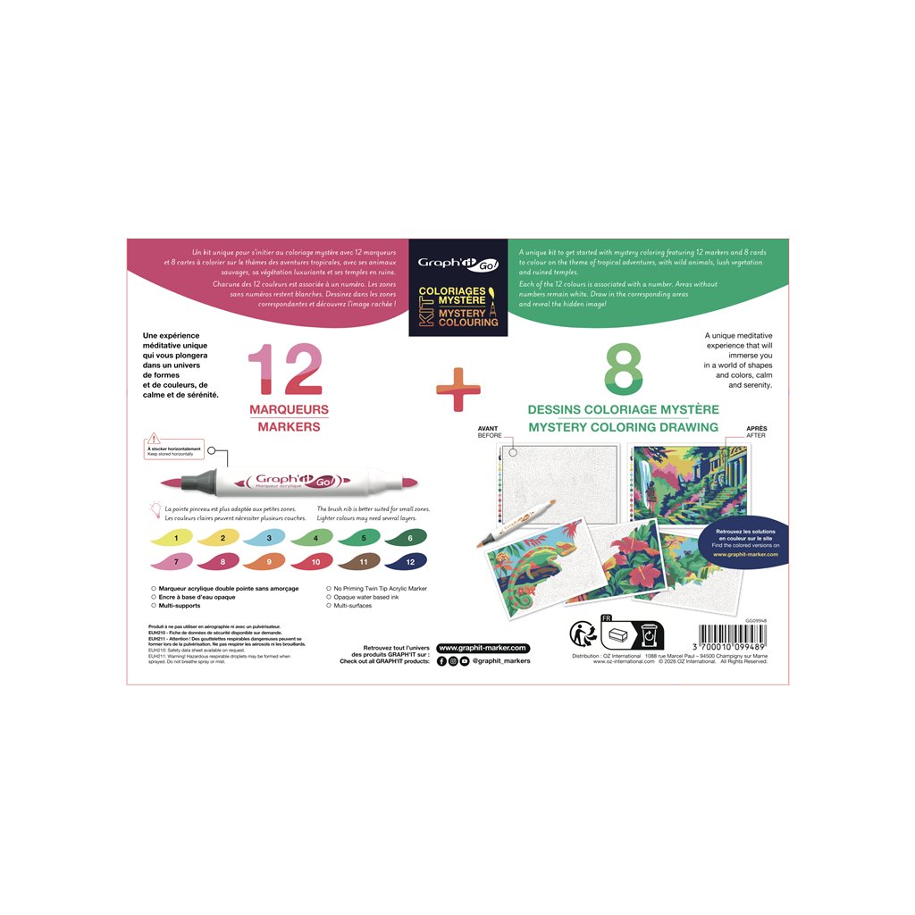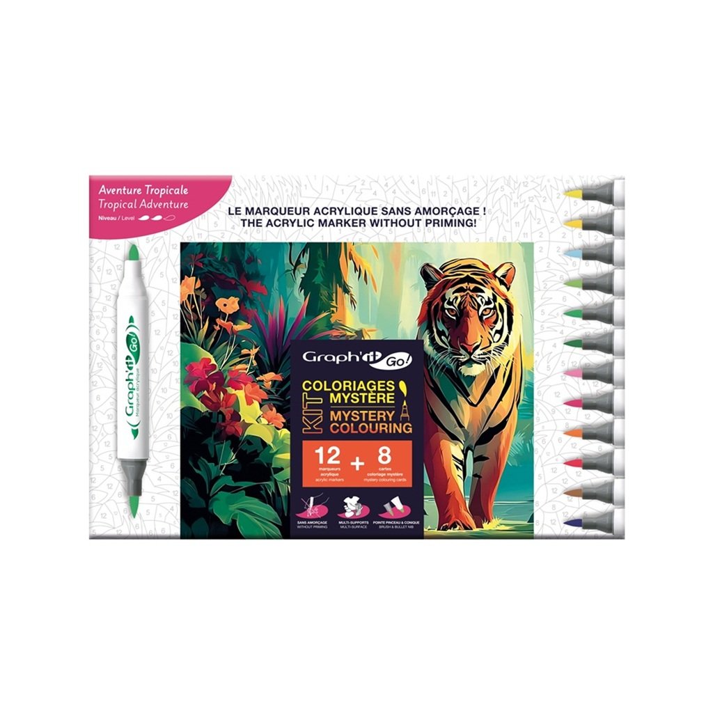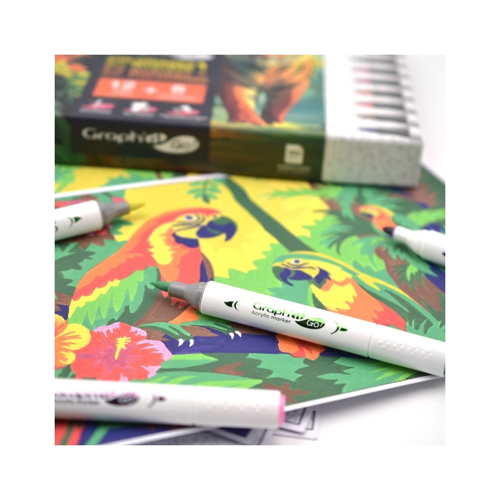 Akrylové fixky GRAPH'IT obojstranné Brush & Fine, 12 ks Tropical Adventure + 8 omaľovánok