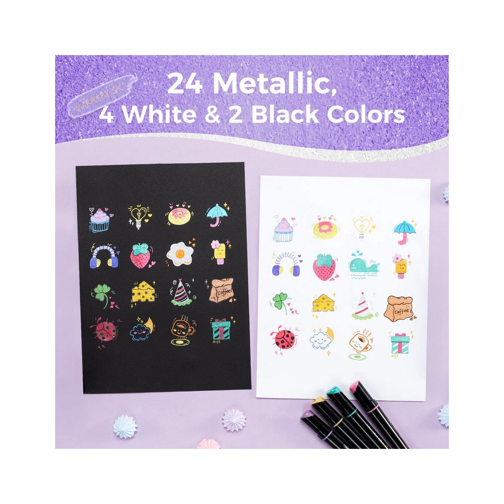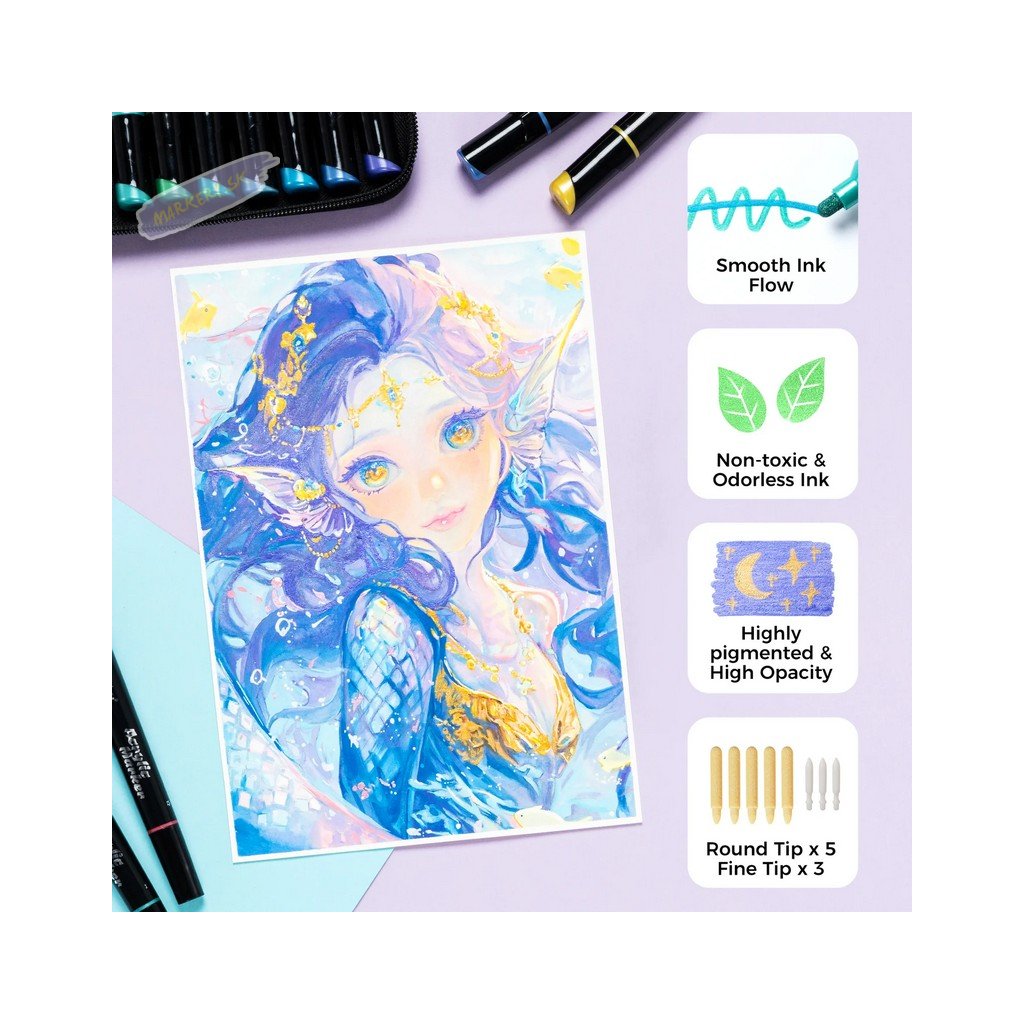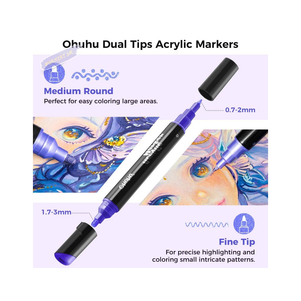 Súprava akrylových popisovačov OHUHU s dvoma hrotmi v praktickom penále. Môžete kresliť na rôzne povrchy, od kamienkov, dreva, látky, keramiky, hrnčekov, pohárov, plastu, papiera, vajec, plátna a mnoho ďalších materiálov. Každý fix má dva hroty: 0,7-2 mm tenký hrot a 1,7-3 mm okrúhly hrot. S vodeodolným atramentom môžete vytvárať umelecké majstrovské diela, ktoré nikdy nevyblednú. Ideálna voľba pre dlhodobejšie umelecké projekty ako graffiti, značenie, maľovanie a farbenie. Vďaka žiarivému a koncentrovanému atramentu na vodnej báze sú akrylové fixy Ohuhu netoxické, bez zápachu a kreslia dokonale hladko, čo vám umožní ľahko vrstviť s veľkým krytím. Veľmi vhodné pre začínajúcich začiatočníkov alebo ostrieľaných umelcov.