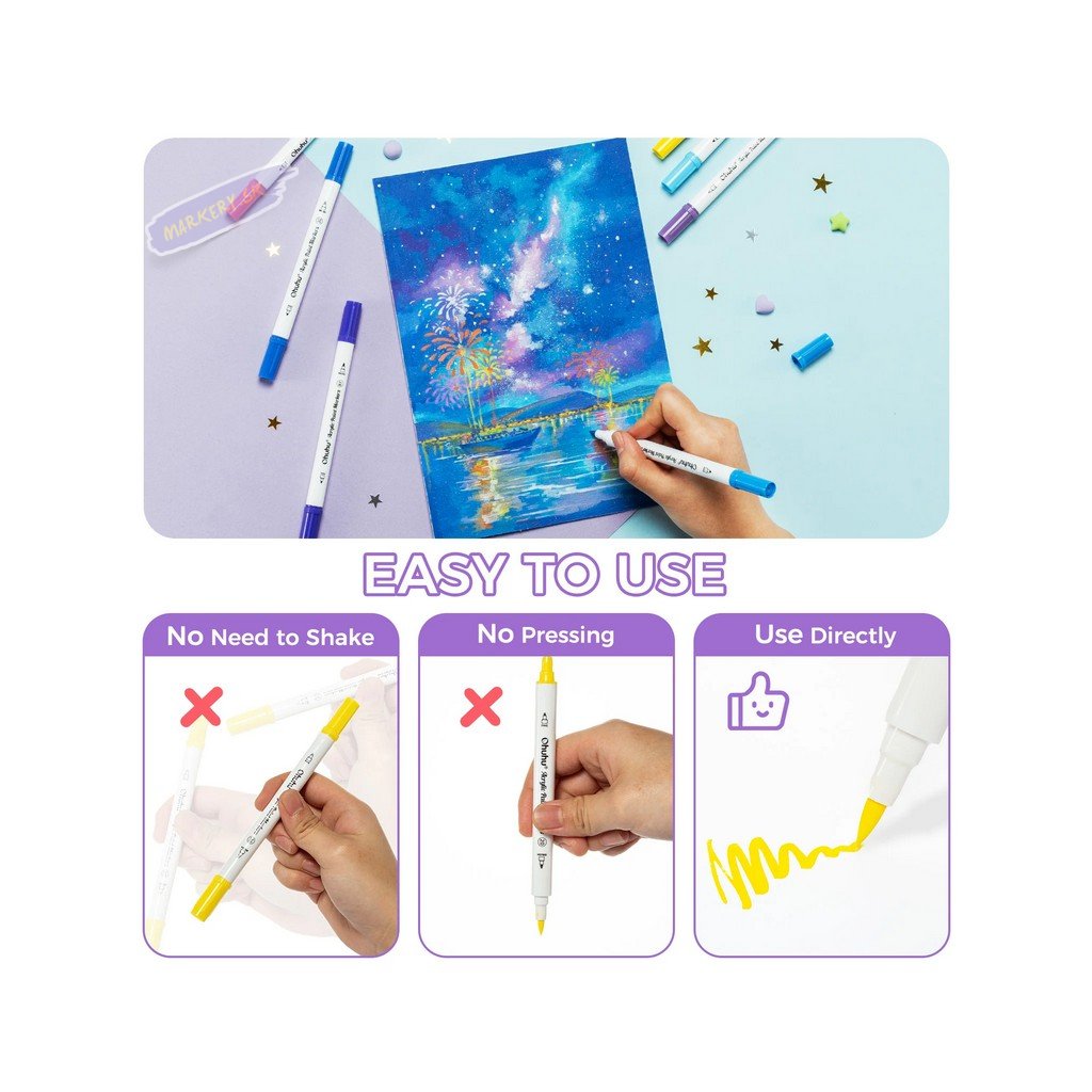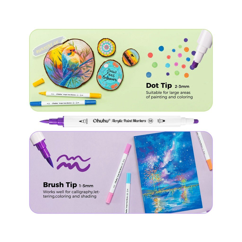 Súprava akrylových fix OHUHU obsahuje 36 úžasných odtieňov s rovnomerným rozložením a plynulými prechodmi, ideálna pre rôzne štýly maľovania a písania. Vďaka výnimočnému krytiu a farebnému výkonu poskytujú tieto fixy brilantné odtiene, ktoré vyniknú aj na čiernom pozadí. Fixa je pripravená na použitie ihneď po otvorení viečka bez nutnosti pumpovania. Farebný kryt a koniec pera umožňujú rýchlu identifikáciu farby na prvý pohľad. Akrylové fixy OHUHU sú vodeodolné, takže sú vhodné pre projekty, ako je maľovanie na kamene, veľkonočné vajíčka a dekorácie na povrchoch, ako je drevo, sklo a keramika.