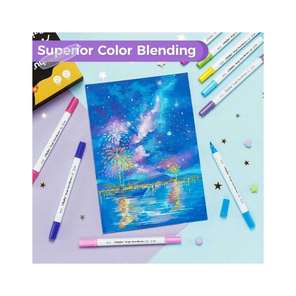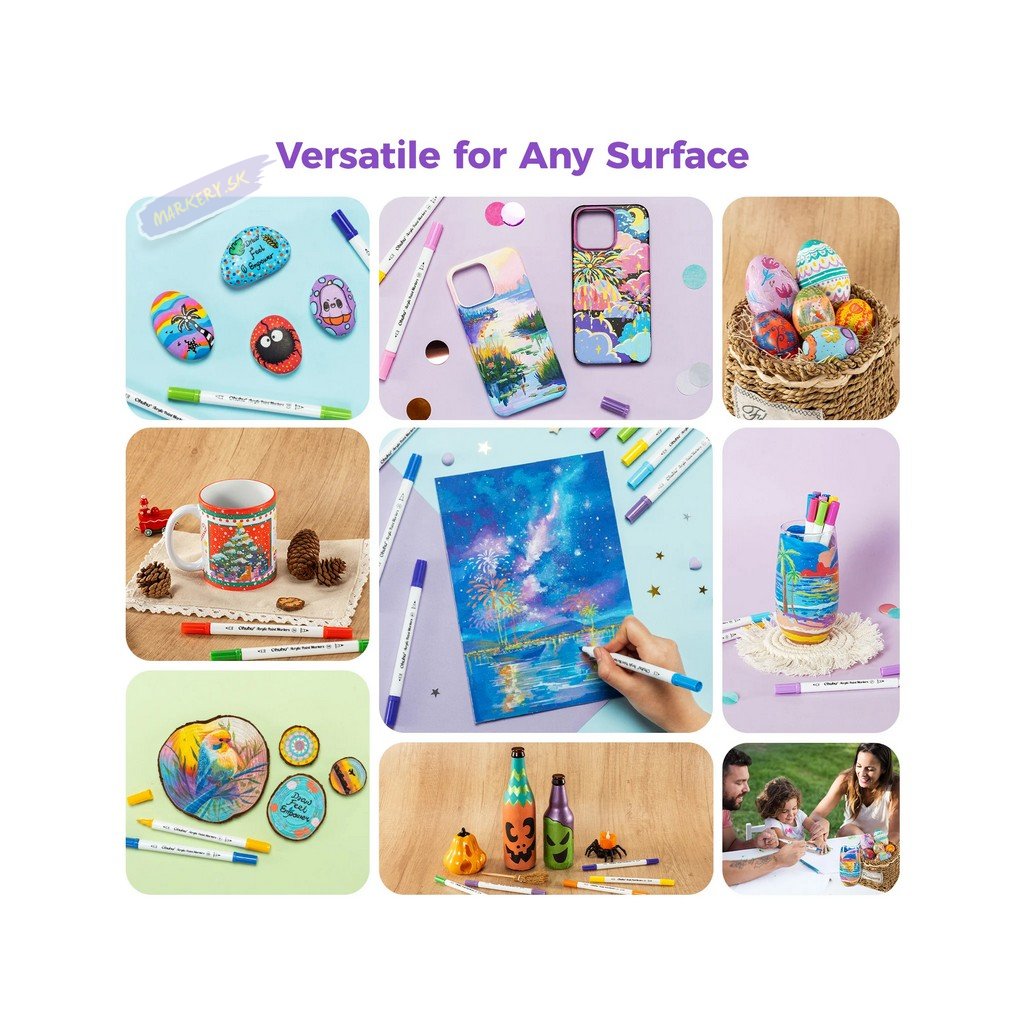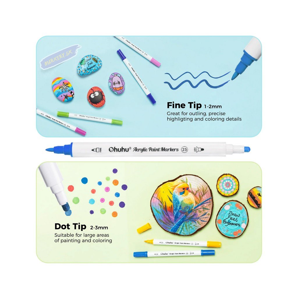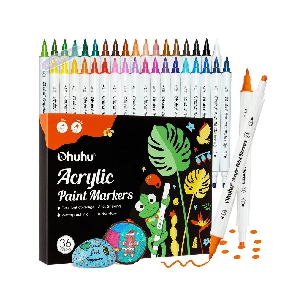 Súprava akrylových fix OHUHU obsahuje 36 úžasných odtieňov s rovnomerným rozložením a plynulými prechodmi, ideálna pre rôzne štýly maľovania a písania. Vďaka výnimočnému krytiu a farebnému výkonu poskytujú tieto fixy brilantné odtiene, ktoré vyniknú aj na čiernom pozadí. Fixa je pripravená na použitie ihneď po otvorení viečka bez nutnosti pumpovania. Farebný kryt a koniec pera umožňujú rýchlu identifikáciu farby na prvý pohľad. Akrylové fixy OHUHU sú vodeodolné, takže sú vhodné pre projekty, ako je maľovanie na kamene, veľkonočné vajíčka a dekorácie na povrchoch, ako je drevo, sklo a keramika.