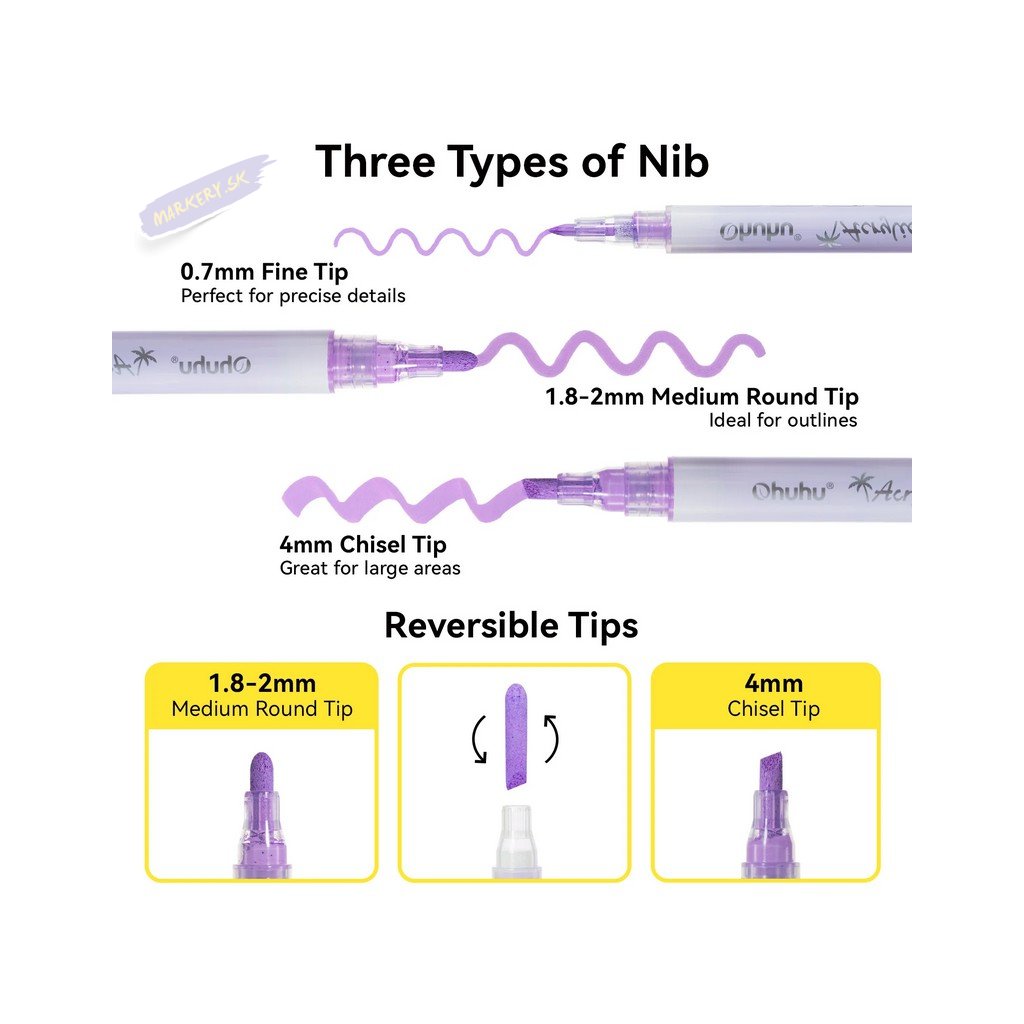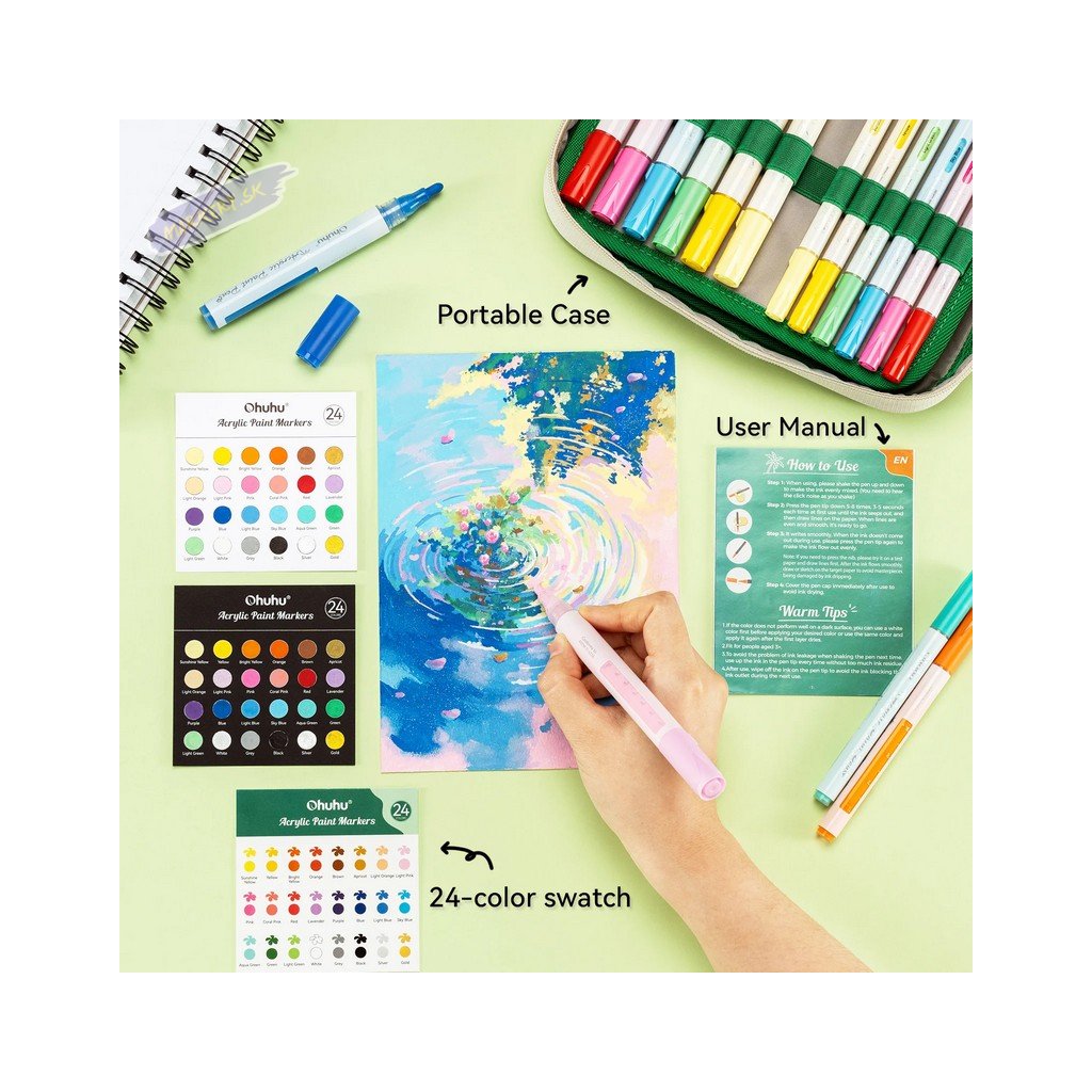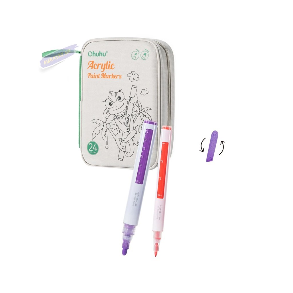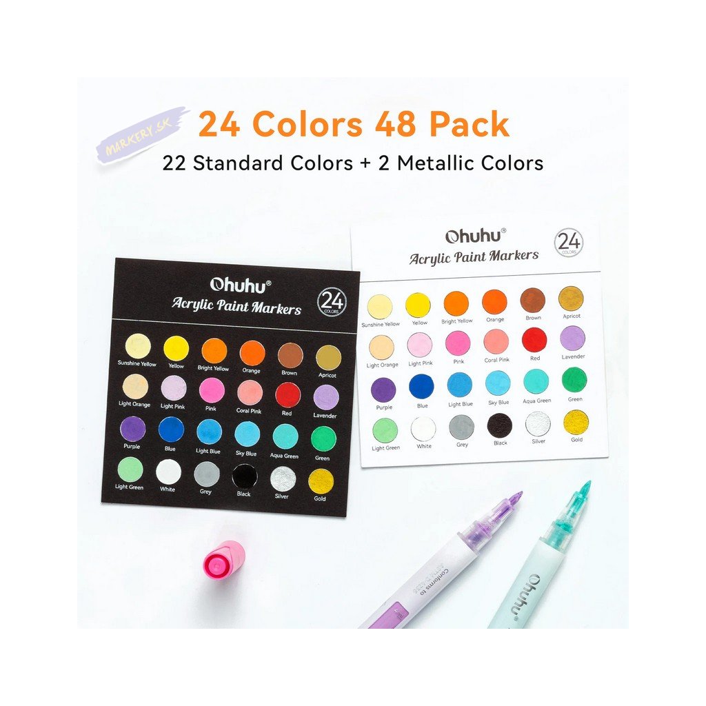 Súprava akrylových fix OHUHU obsahuje 24 popisovačov s tenkým pevným hrotom a 24 popisovačov so stredne silným okrúhlym hrotom, všetky v žiarivých farbách, ideálne pre vdýchnutie života vašim kreatívnym projektom. Či už ste ilustrátor, nadšenec do tvorenia alebo milovník majstrovania, tieto farebné fixky sú navrhnuté tak, aby inšpirovali a naplnili všetky vaše umelecké ambície. Každá sada obsahuje 24 farieb v dvoch rôznych variantoch hrotov s tým, že silnejší okrúhly hrot je možné otočiť na šikmý zrezaný hrot. Jednoducho zatiahnite za hrot na zmenu strany – ideálny pre široké ťahy. Fixy OHUHU sú netoxické, bez zápachu a vyrobené pre dlhú životnosť. Vďaka vode a slnku odolnému atramentu sú ideálne pre dlhodobé projekty, ako je graffiti, značenie, maľovanie a farbenie. Tieto všestranné fixy fungujú skvele na kameňoch, dreve, látkach, keramike, hrncoch, skle, plaste, papieri, vajciach, plátne a ďalších materiáloch.