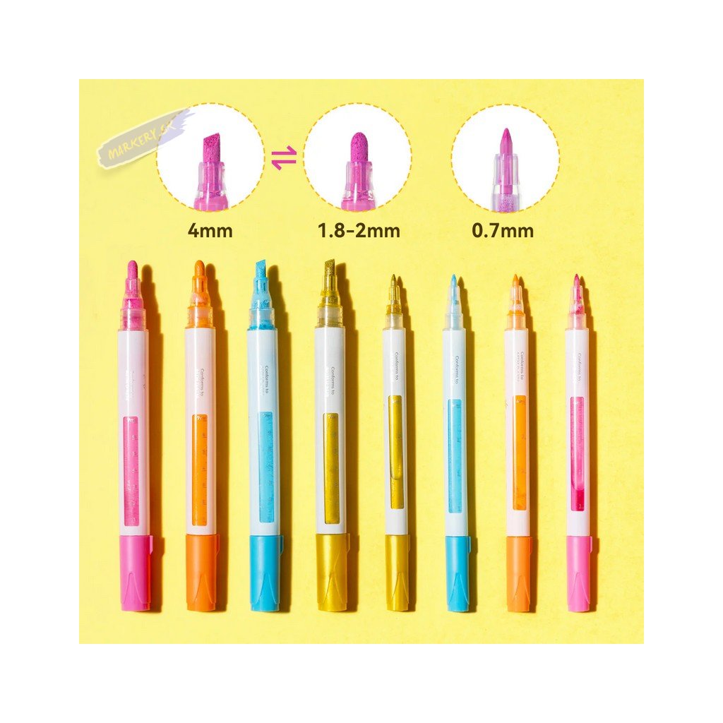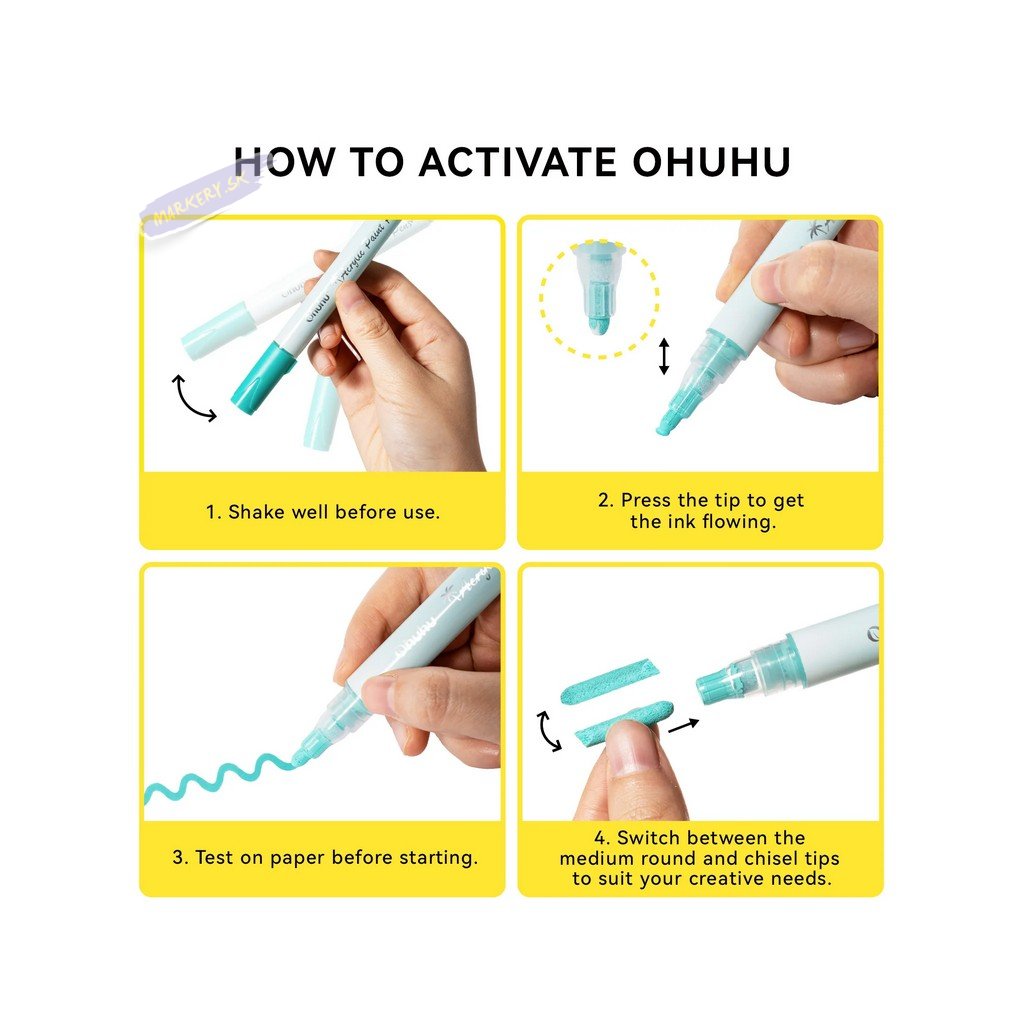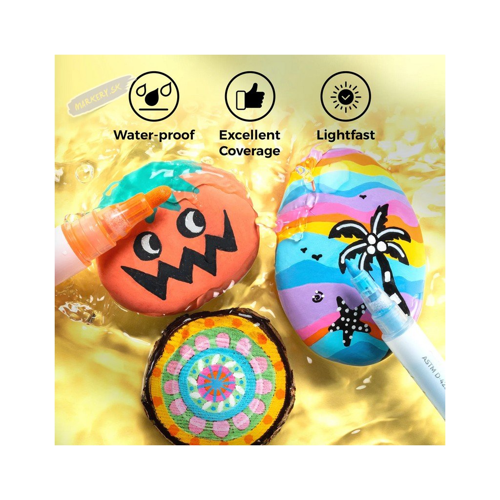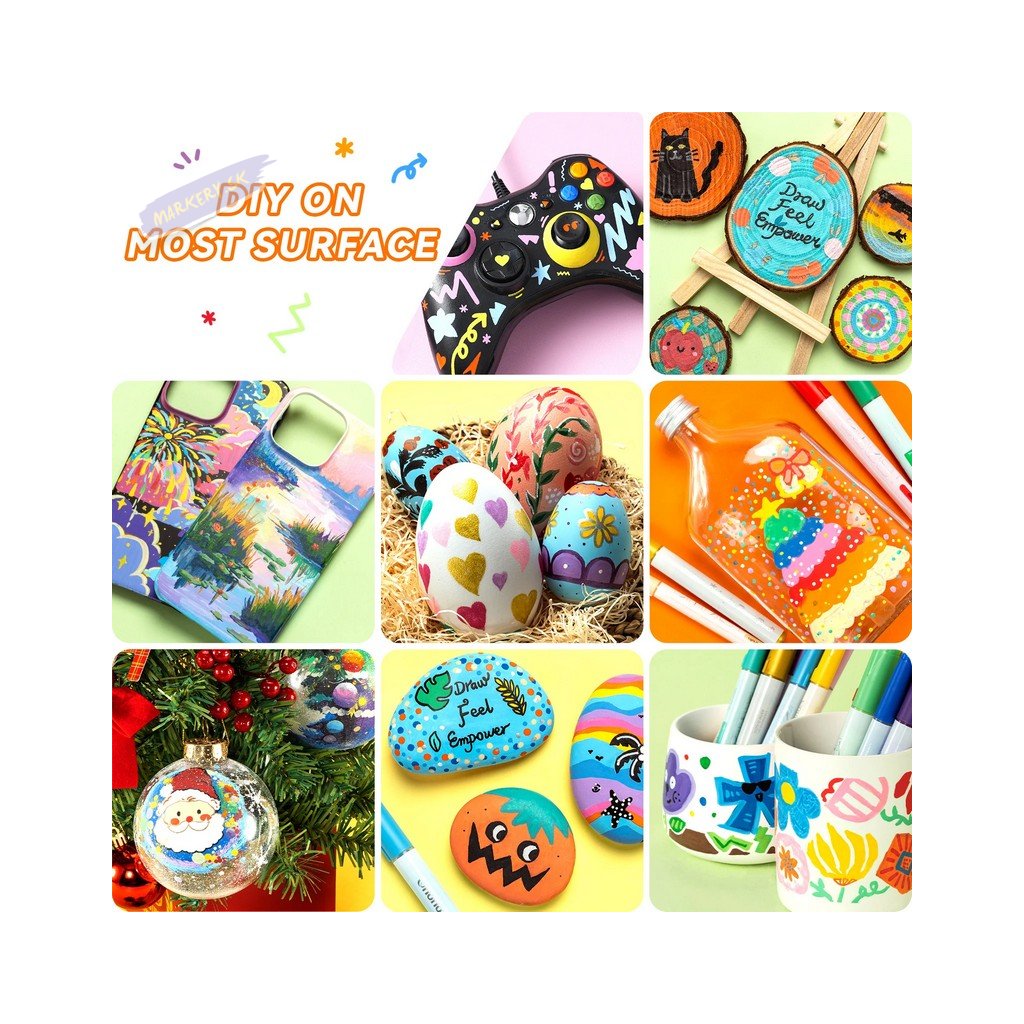 Súprava akrylových fix OHUHU obsahuje 24 popisovačov s tenkým pevným hrotom a 24 popisovačov so stredne silným okrúhlym hrotom, všetky v žiarivých farbách, ideálne pre vdýchnutie života vašim kreatívnym projektom. Či už ste ilustrátor, nadšenec do tvorenia alebo milovník majstrovania, tieto farebné fixky sú navrhnuté tak, aby inšpirovali a naplnili všetky vaše umelecké ambície. Každá sada obsahuje 24 farieb v dvoch rôznych variantoch hrotov s tým, že silnejší okrúhly hrot je možné otočiť na šikmý zrezaný hrot. Jednoducho zatiahnite za hrot na zmenu strany – ideálny pre široké ťahy. Fixy OHUHU sú netoxické, bez zápachu a vyrobené pre dlhú životnosť. Vďaka vode a slnku odolnému atramentu sú ideálne pre dlhodobé projekty, ako je graffiti, značenie, maľovanie a farbenie. Tieto všestranné fixy fungujú skvele na kameňoch, dreve, látkach, keramike, hrncoch, skle, plaste, papieri, vajciach, plátne a ďalších materiáloch.