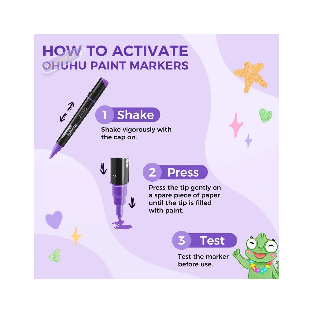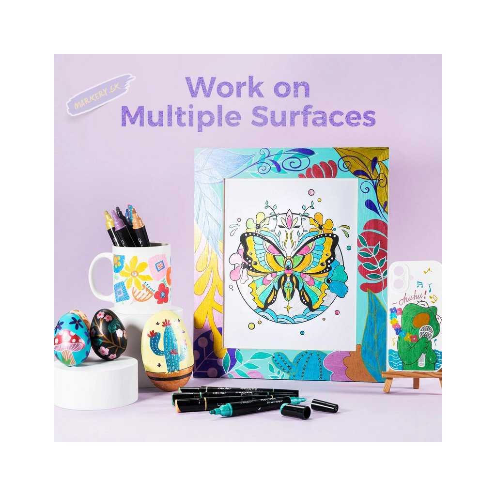 Súprava akrylových popisovačov OHUHU s dvoma hrotmi v praktickom penále. Môžete kresliť na rôzne povrchy, od kamienkov, dreva, látky, keramiky, hrnčekov, pohárov, plastu, papiera, vajec, plátna a mnoho ďalších materiálov. Každý fix má dva hroty: 0,7-2 mm tenký hrot a 1,7-3 mm okrúhly hrot. S vodeodolným atramentom môžete vytvárať umelecké majstrovské diela, ktoré nikdy nevyblednú. Ideálna voľba pre dlhodobejšie umelecké projekty ako graffiti, značenie, maľovanie a farbenie. Vďaka žiarivému a koncentrovanému atramentu na vodnej báze sú akrylové fixy Ohuhu netoxické, bez zápachu a kreslia dokonale hladko, čo vám umožní ľahko vrstviť s veľkým krytím. Veľmi vhodné pre začínajúcich začiatočníkov alebo ostrieľaných umelcov.