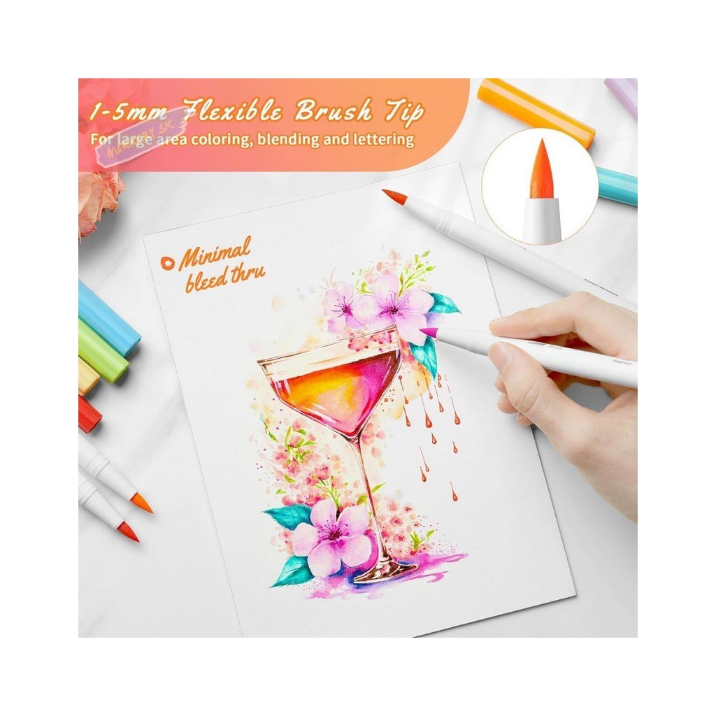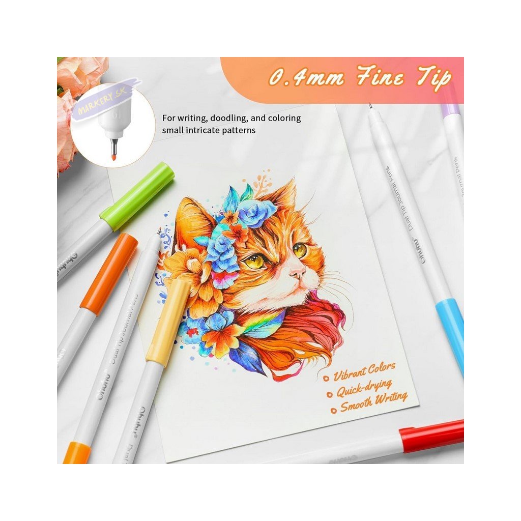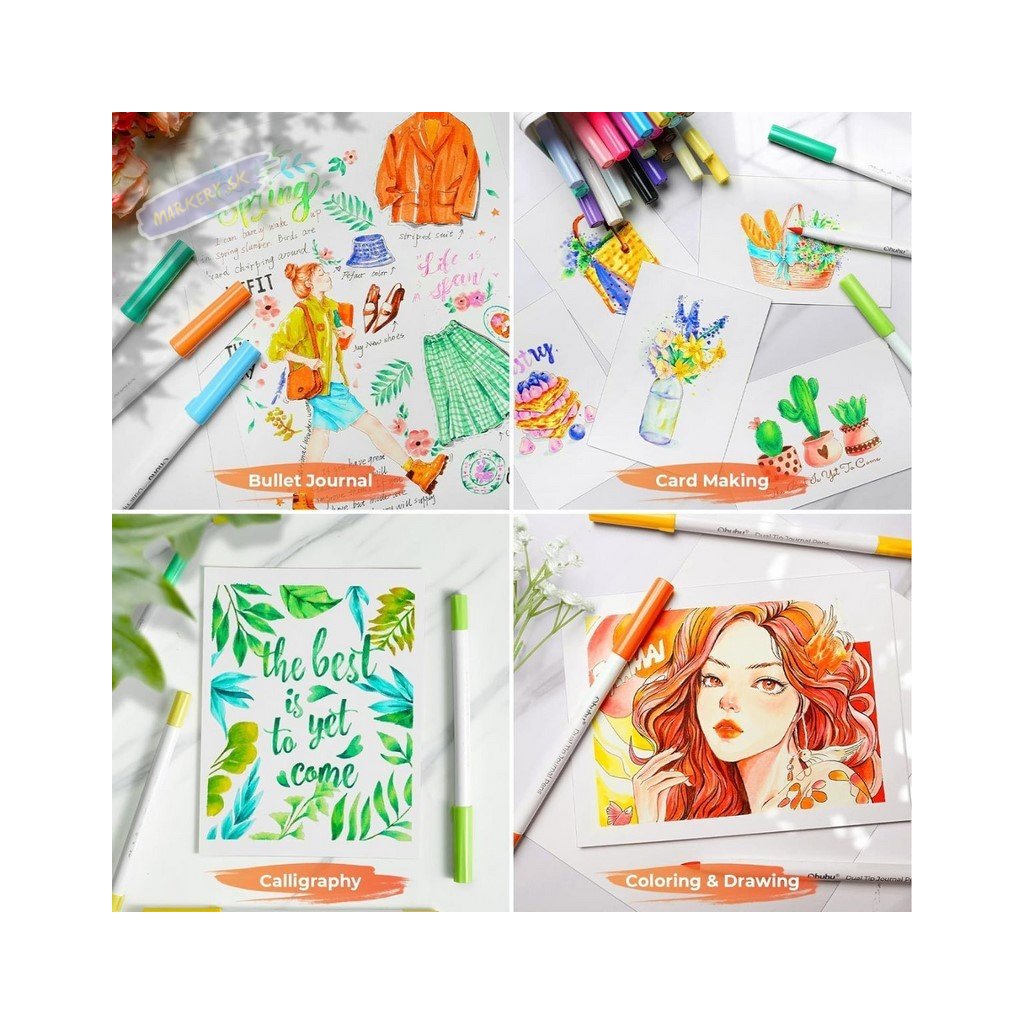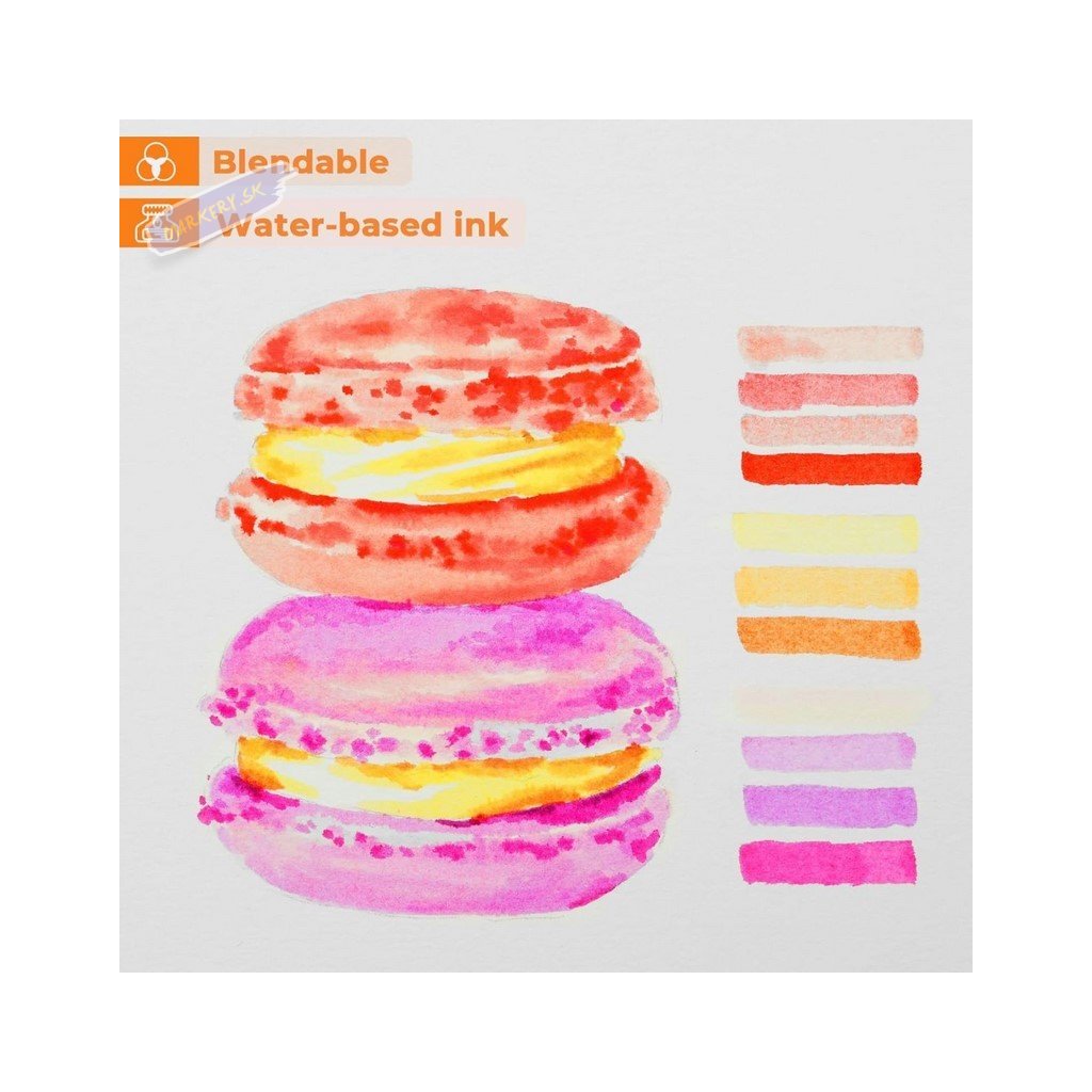 Umelecké akvarelové fixky OHUHU majú dva odolné hroty s plynulým tokom atramentu. Špeciálne navrhnutý pre bullet journal: 0,4 mm extra tenký kovový hrot môže vytvárať jemné detaily s plynulou presnosťou, zatiaľ čo 1-5 mm flexibilný štetcový hrot sa používa na väčšie umelecké projekty.Atrament je rozpustný vo vode a krásne akvarelové efekty môžete dosiahnuť tak, že papier najskôr navlhčíte vodným štetcom a potom oblasť zafarbíte farbami, ktoré chcete zmiešať.