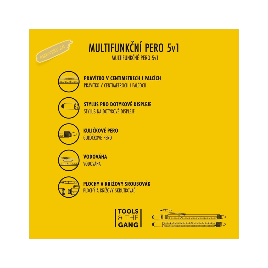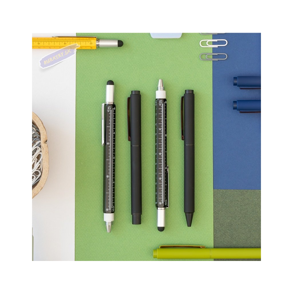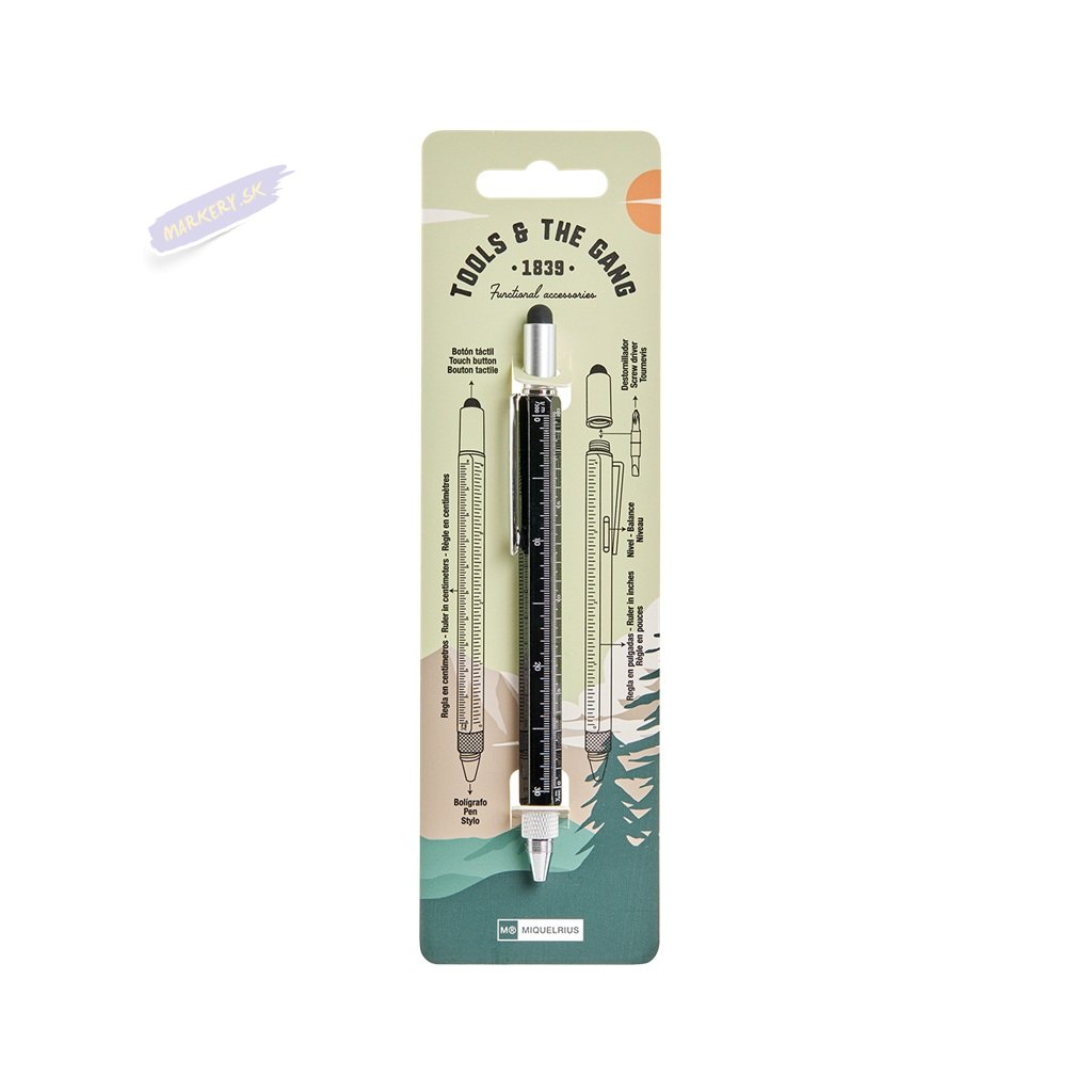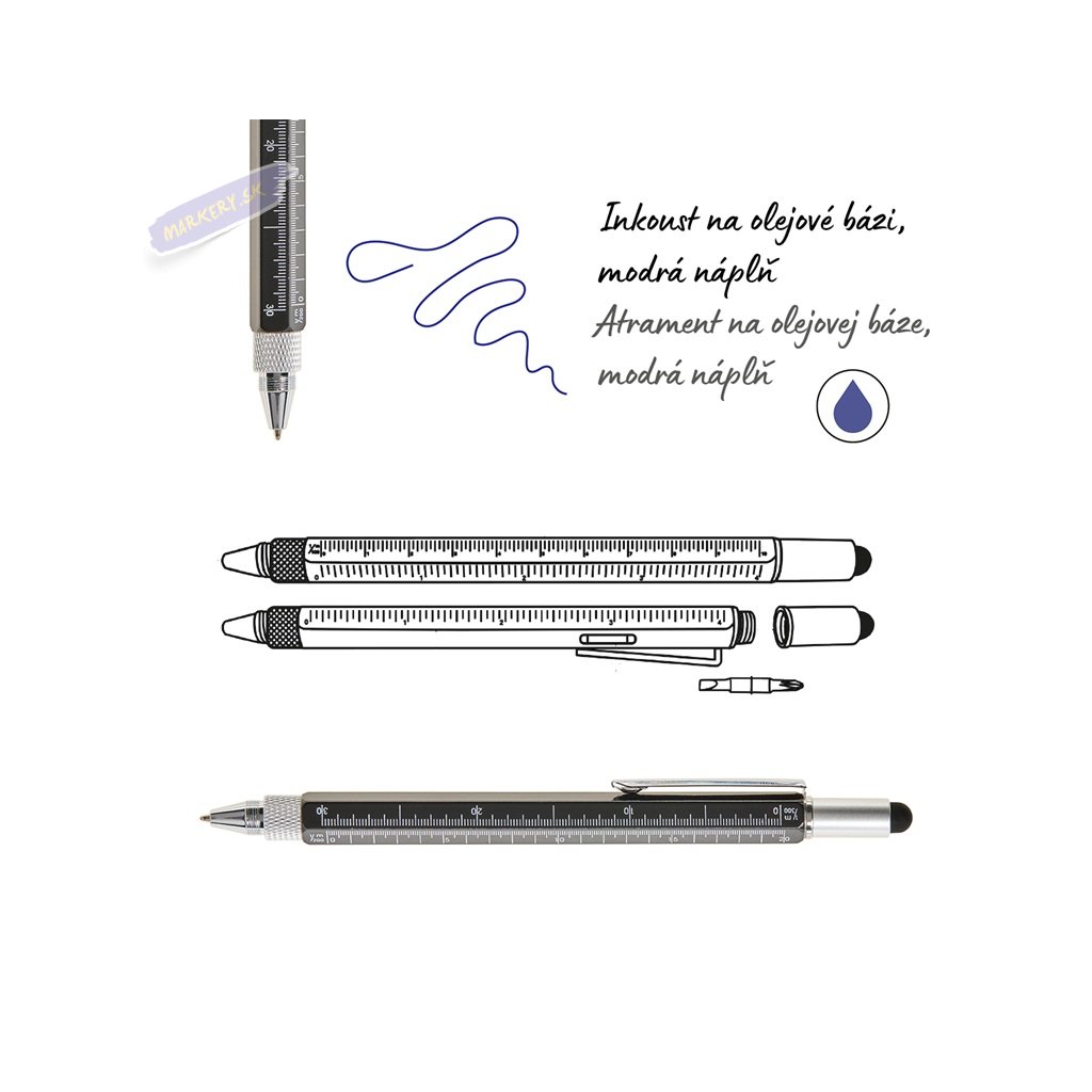 Multifunkčné guličkové pero spája elegantný písací nástroj s piatimi užitočnými funkciami, ktoré využijete doma, v kancelárii aj na cestách. Skvelé vychytávky, ktoré máte vždy po ruke. Okrem guličkového pera obsahuje pravítko v centimetroch aj palcoch, vodováhu, plochý a krížový skrutkovač a dotykový stylus pre smartfóny a tablety. Modrá náplň, atrament na olejovej báze, ktorý hladko kĺže po papieri.