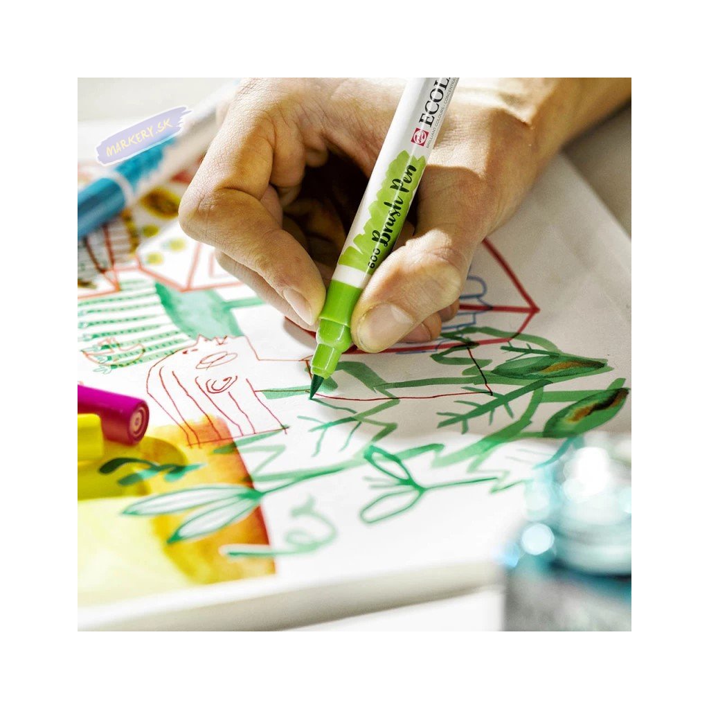 Obľúbená vodová farba ECOLINE je taktiež vo forme praktického štetkového markeru. Farba je typická svojou riedkou konzistenciou, vysokou transparentnosťou, intenzitou a jasom odtieňov. Vďaka obsahu indickej gumy má aj vysoký lesk. Marker je výnimočne praktický. Oproti práci s klasickým štetcom nepotrebujete žiadne príslušenstvo, farba nekvapká a nešpiní, môžete s ním pracovať okamžite, výborne sa hodí napríklad na tvorbu na cestách. ECOLINE BRUSH PEN je bez zápachu.