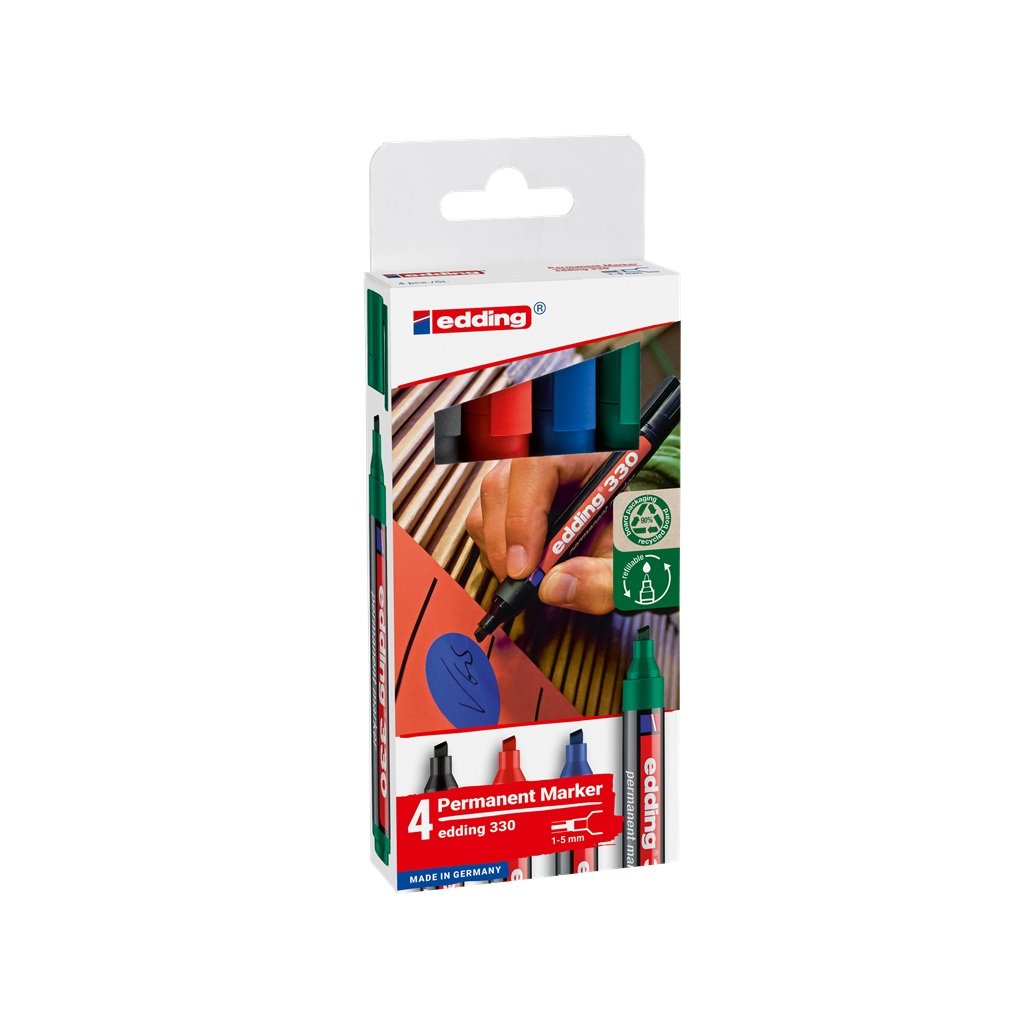 Univerzálny permanentný popisovač Edding 330 sa používa na trvalý popis najrôznejších povrchov (kov, drevo, plast, sklo, kartón, koža). Rýchloschnúci, svetlostály, vodeodolný a oteru odolný atrament na alkoholovej báze neobsahuje toluén ani xylén. Uplatnenie nájde vo výrobe, v skladoch, v logistike, v kanceláriách, v domácnostiach, na záhradách aj v dielňach. Využiteľný je pre popisy v interiéri aj exteriéri. Fix s plastovým telom je znovu naplniteľný (náhradný atrament Edding MTK 25) - predĺžením životnosti liehovky pomôžete znížiť množstvo komunálneho odpadu. Sada 4 farieb: čierna, modrá, červená, zelená. Skosený hrot. Šírka stopy: 1-5 mm.Dodatočné parametre