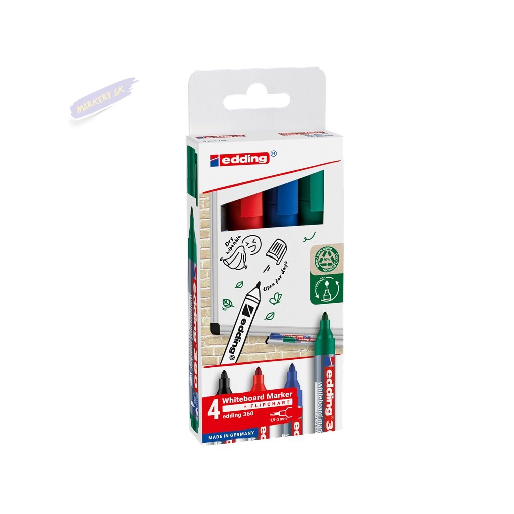Popisovač na biele tabule Edding 360 obsahuje špeciálny cap-off atrament, ktorý nevyschne, pokiaľ je popisovač ponechaný pár dní bez viečka. Popisovač je možné použiť aj na flipcharty a má vymeniteľný okrúhly hrot. Napísaná stopa rýchlo zasychá, je svetlostála a je stierateľná za sucha. Klip na viečku bráni skotáleniu popisovača.