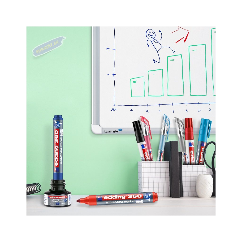 Popisovač na biele tabule Edding 360 obsahuje špeciálny cap-off atrament, ktorý nevyschne, pokiaľ je popisovač ponechaný pár dní bez viečka. Popisovač je možné použiť aj na flipcharty a má vymeniteľný okrúhly hrot. Napísaná stopa rýchlo zasychá, je svetlostála a je stierateľná za sucha. Klip na viečku bráni skotáleniu popisovača.