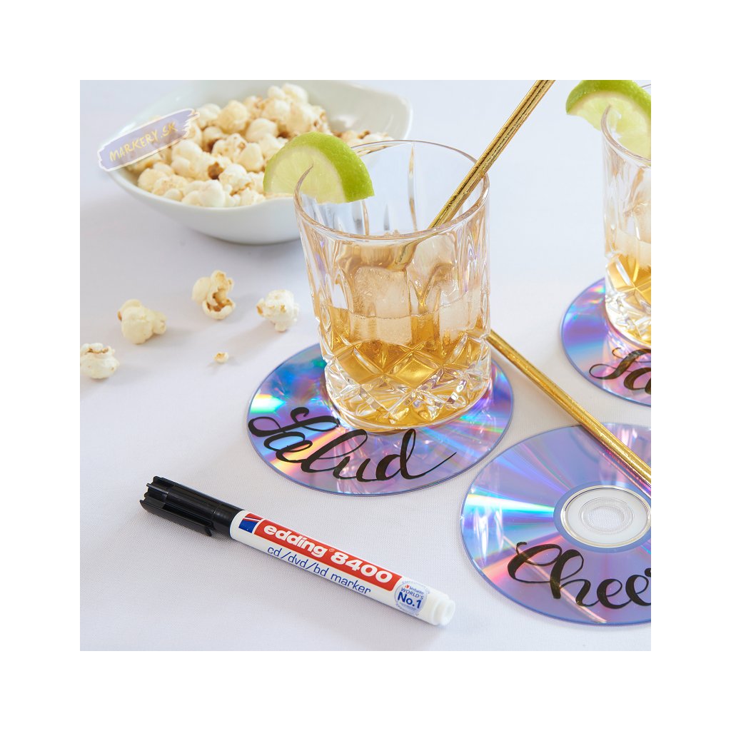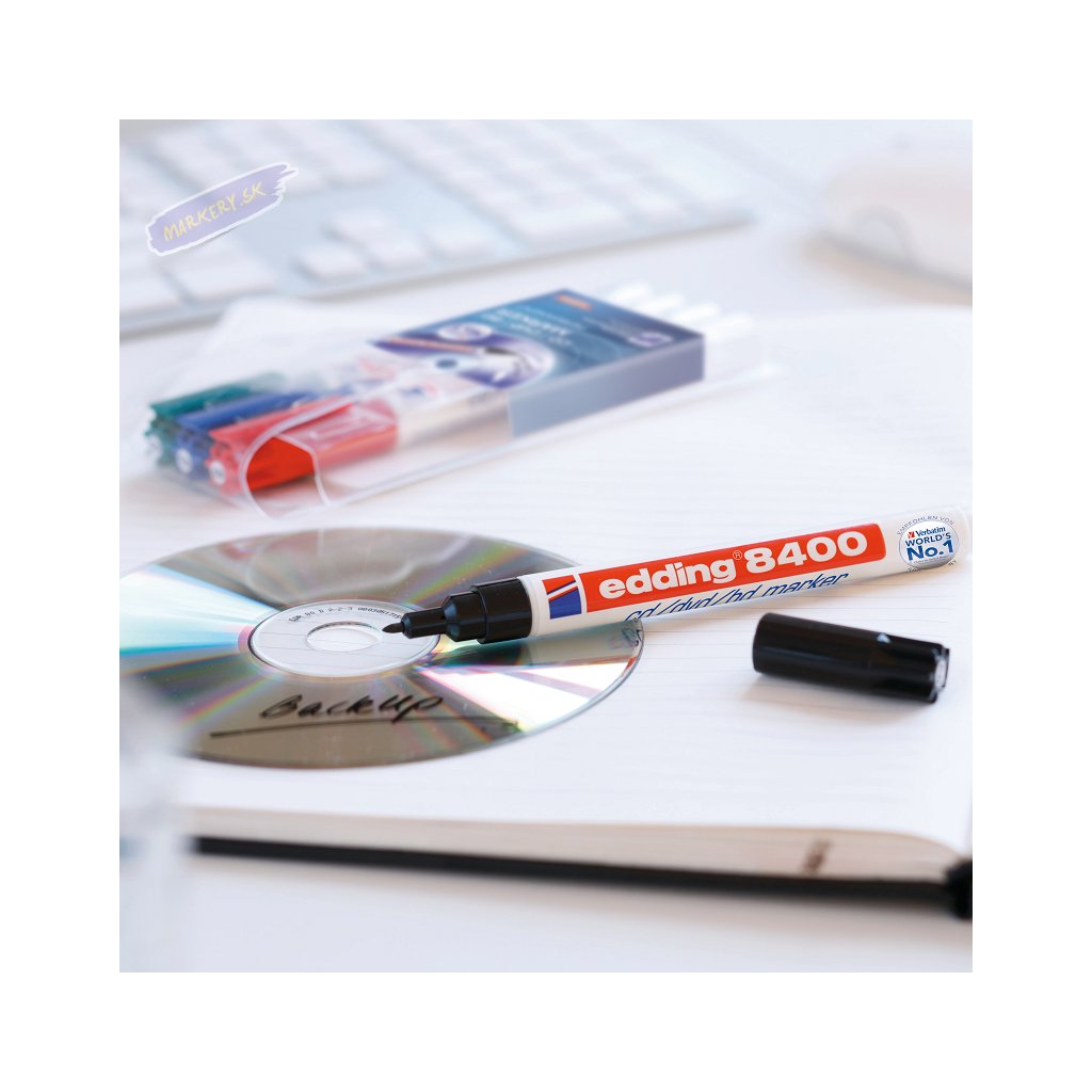 Permanentný fix Edding 8400 pre spoľahlivé značenie CD, DVD aj Blue-ray diskov má jemný flexibilný hrot, ktorý nepoškodzuje povrch disku a nenarušuje bezpečnosť uložených dát. Produkt Edding 8400 bol špeciálne vyvinutý na popis diskov a je odporúčaný spoločnosťou Verbatim. Tenký okrúhly hrot.