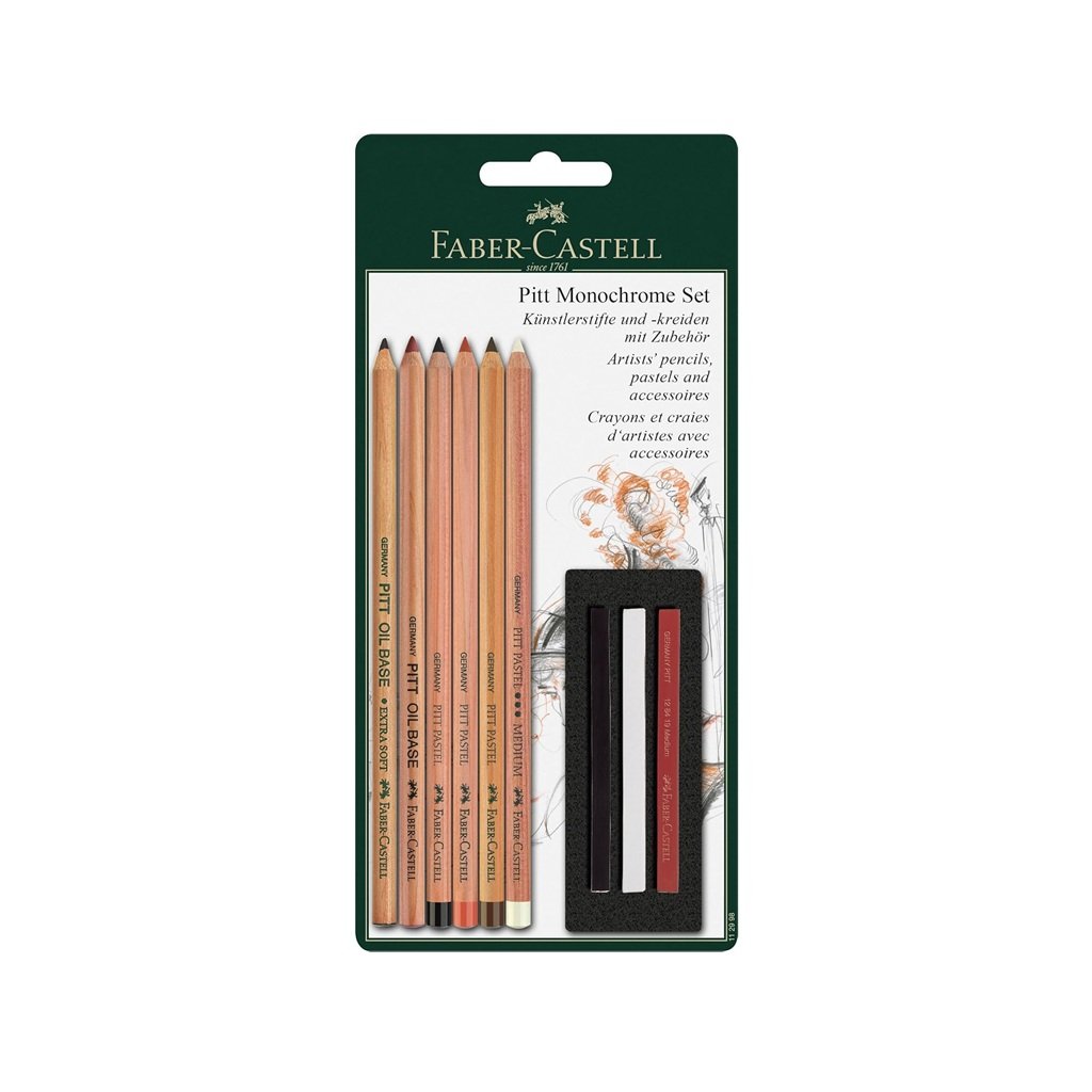 Sada obsahuje 2 umelecké ceruzky Pitt Oil Base (čierná extra mäkká, hnedá), 4 umelecké pastely Pitt Pastel (bielá, orechová, hnedá, čierná) a 3 pastely Pitt Pastel (bielý, hnedý, čierný).