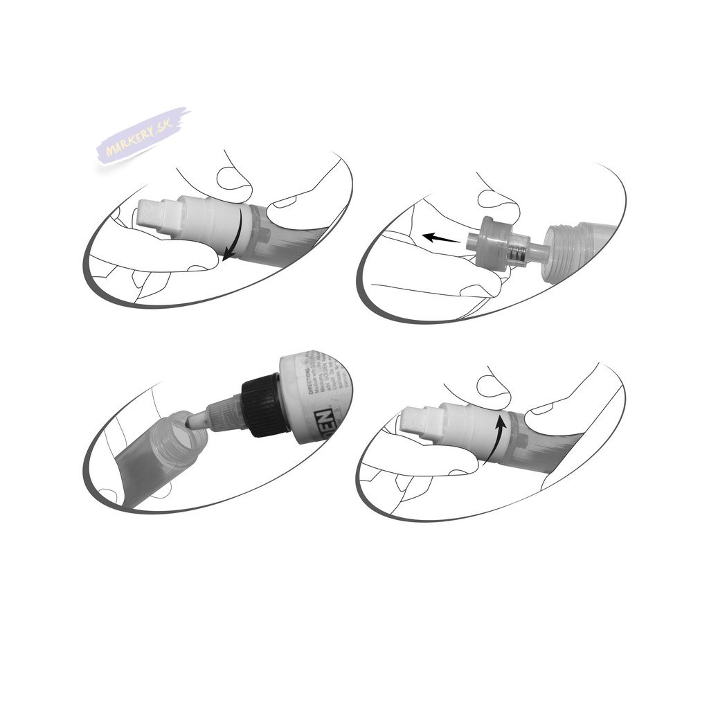 Kompatibilný s farbou Shake Ink. Popisovač môžete naplniť vybranou náplňou, tú zmiešať s vodou, potrepať a vytvárať tým efekt vodových farieb. Pred použitím vždy pretrepte. Hrot sa naplní tekutinou po stlačení. Pri zatváraní dávajte pozor, aby viečko cvaklo - tým sa zaistí jeho vzduchtesnosť a zabránite tým vysychaniu farby.