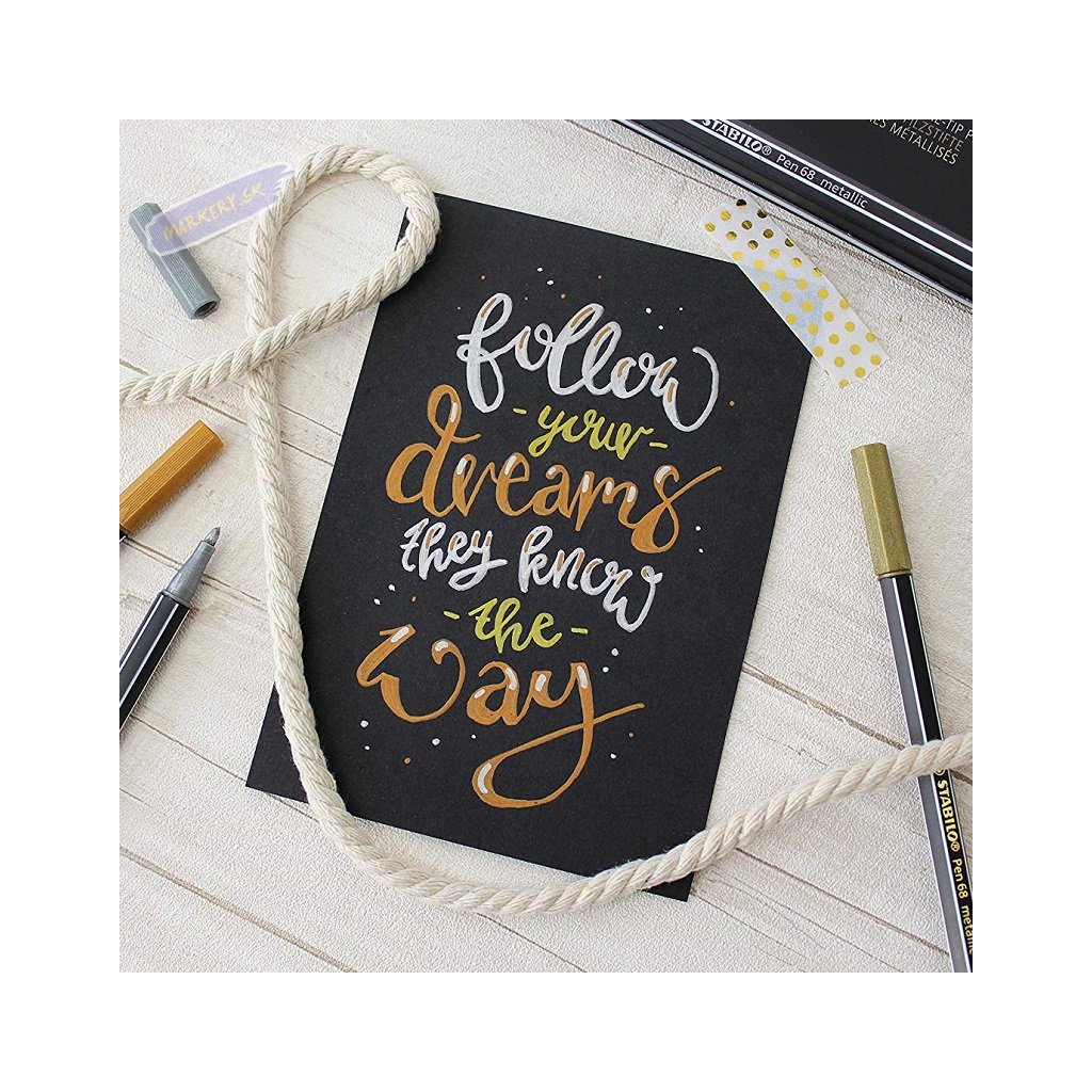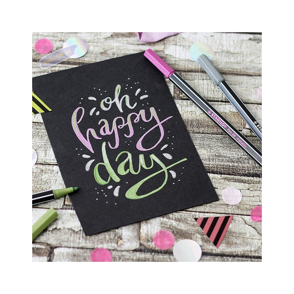 Vláknový metalický fix STABILO Pen 68 je ideálny na dekorácie, kreslenie, lettering a dodá výtvarným dielom špeciálny a oslňujúci šmrnc. Vďaka vysokej intenzite farieb a 8 odtieňom vytvára žiarivé efekty a skvele vynikne na farebnom, bielom a najmä tmavom podklade. S fixkami môžete začať ihneď pracovať, nie je potrebné ich pred použitím rozpisovať, alebo pretrepávať. Náplň na vodnej báze je bez zápachu v porovnaní s produktmi s náplňou na báze alkoholu. To umožňuje tvoriť kreatívne diela úplne bez rozptyľovania. Vybrané prémiové pigmenty v náplni zaisťujú vysokú farebnú stálosť, čo znamená, že vaše výtvarné kresby si zachovajú lesk po dlhú dobu a vy si ich budete môcť užívať, ako dlho budete chcieť.