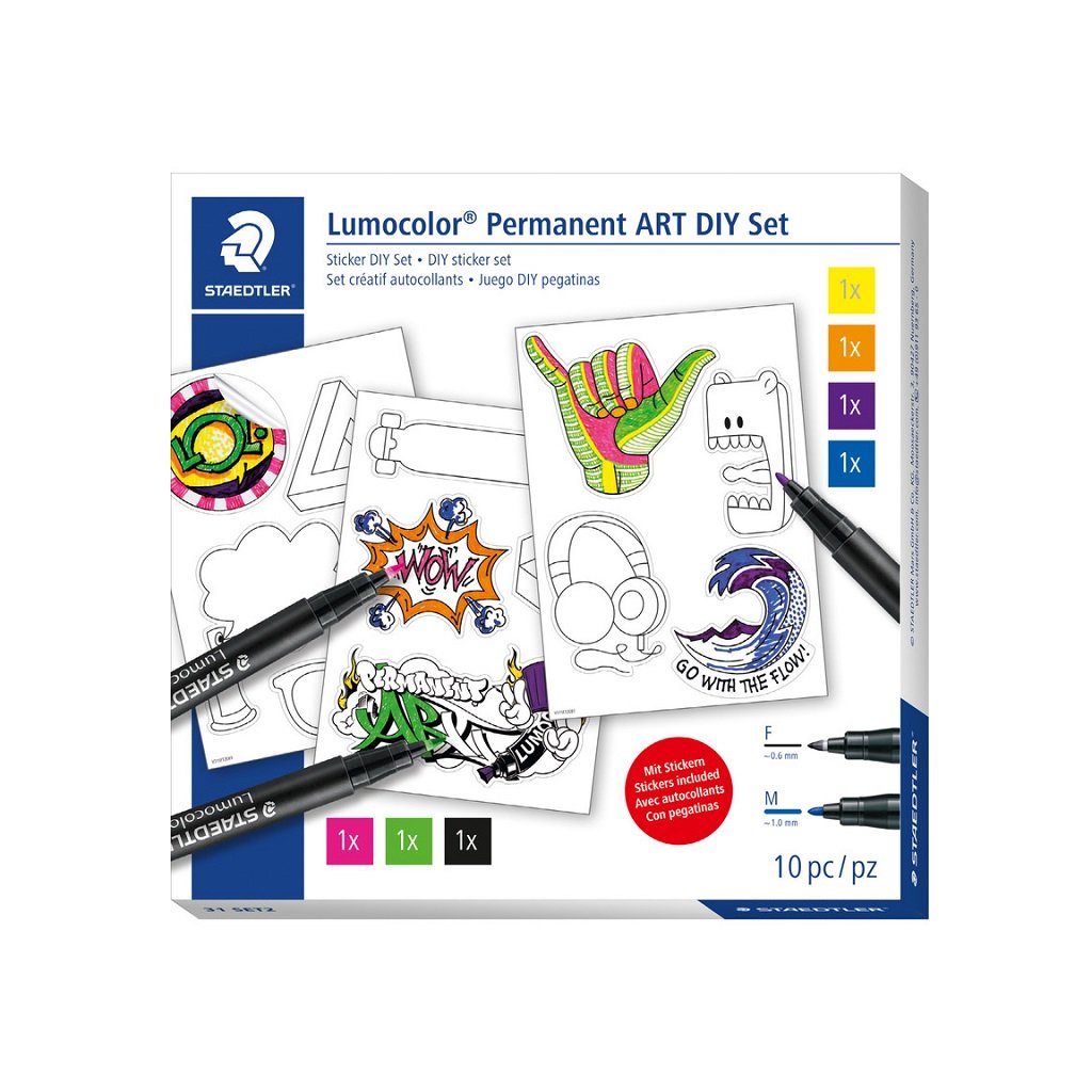 Sada obsahuje 7 permanentných popisovačov STAEDTLER Lumocolor v najrôznejších farbách a dvoch šírkach čiar F a M. Ďalej sada obsahuje 3 archy samolepiek na vyfarbenie.