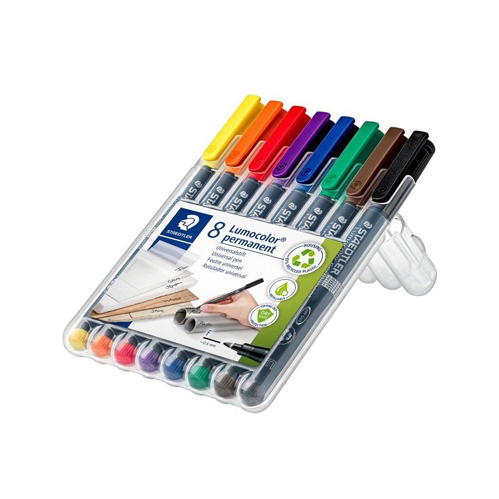 Súprava univerzálnych permanentných popisovačov od značky STAEDTLER pre väčšinu povrchov. Atrament je svetlostály, vodeodolný a odolný proti rozmazaniu. Nevysychajúci, plniteľný, rýchloschnúci, vhodný aj pre ľavákov.