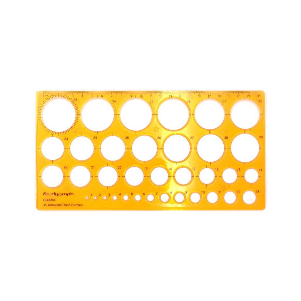 Šablóna Graph'It z ohybného a priehľadného plastu pre ľahké kreslenie kružníc. Šablóna obsahuje 35 kružníc o veľkosti 1-35mm. Pravítko na okrajoch v cm.