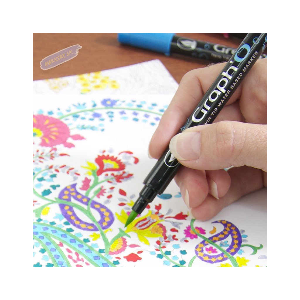 Obojstranný popisovač na vodnej báze: mäkký a flexibilný štetcový hrot a veľmi tenký hrot pre detailné linky. Atrament je ľahko priesvitný a bez zápachu. Je rozpustný vodou pre ľahšie blendovanie a efekt vodových farieb.