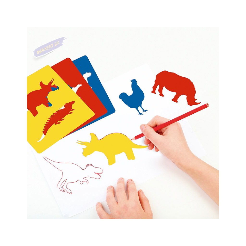 Sada šablón s najznámejšími typmi zvierat pre nekonečné možnosti kreslenia, maľovania a tvorenia. Vyrobená z kvalitného a odolného polypropylénu, ktorý je odolný a ľahko umývateľný. Šablóny umožňujú kresliť vnútorné aj vonkajšie obrysy, ale aj maľovať alebo tlačiť pomocou hubiek. Podpora a rozvoj jemnej motoriky dieťaťa. Rozmer šablóny: 15,3 × 14,3 cm.
