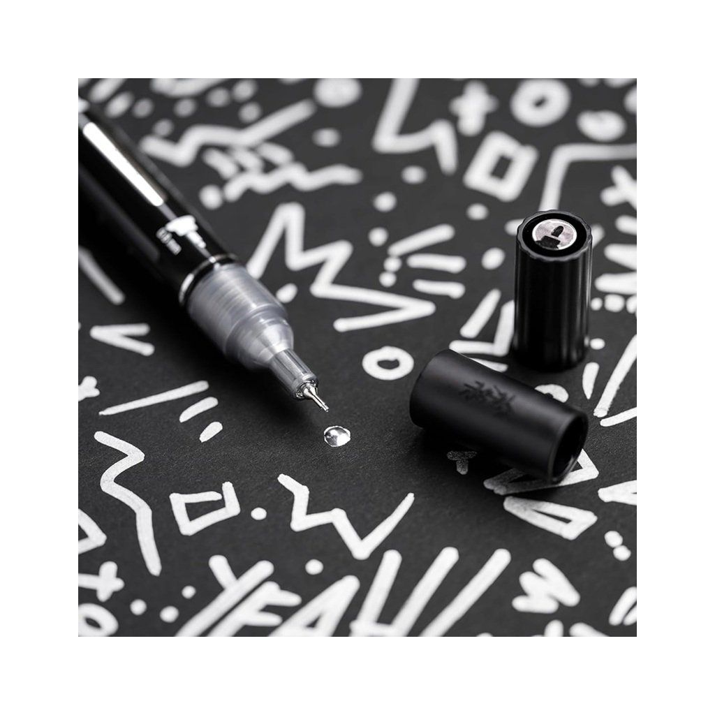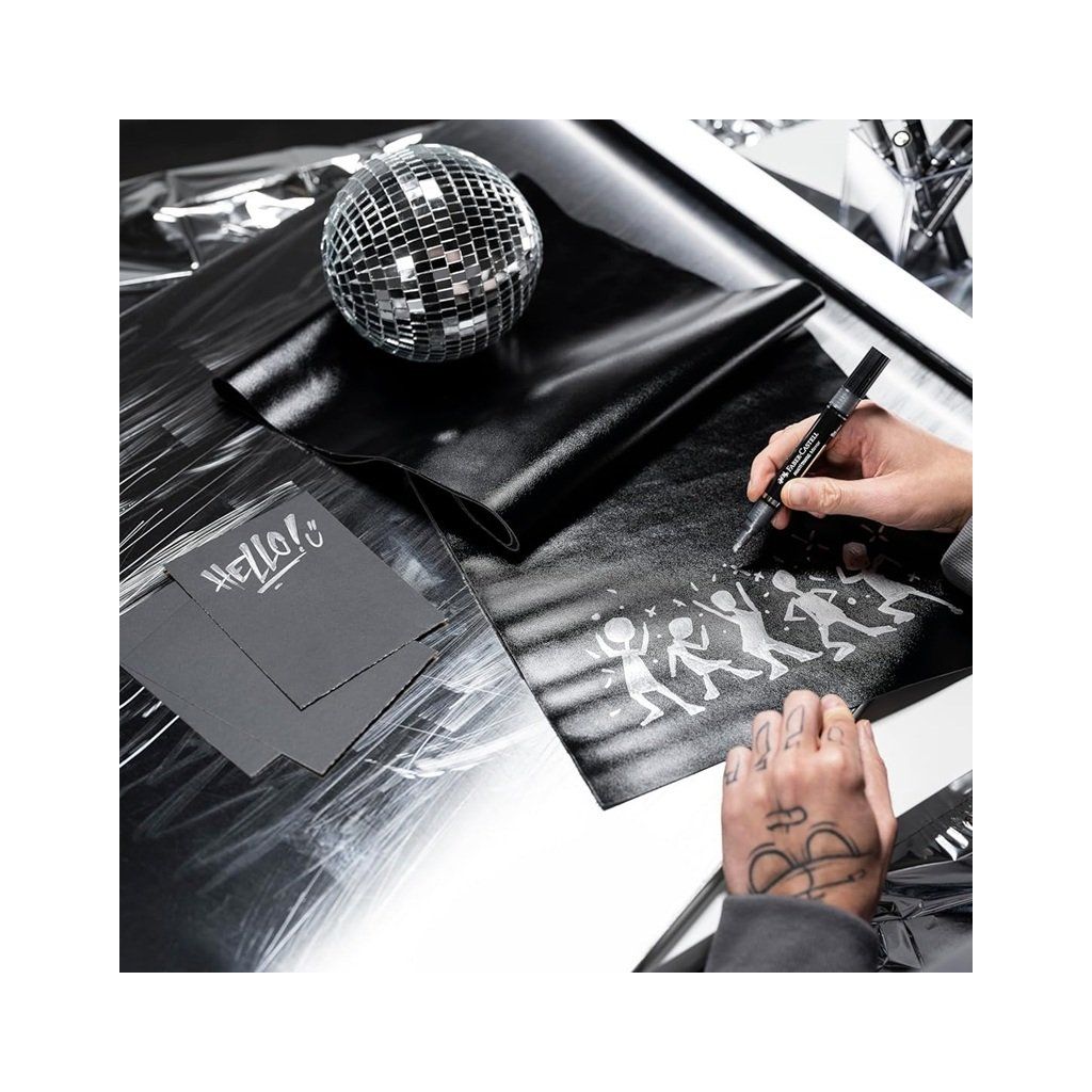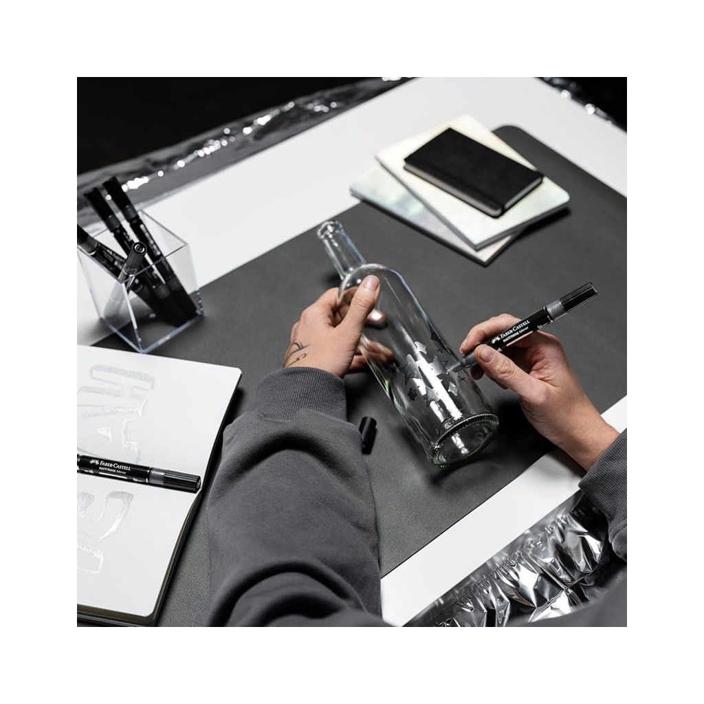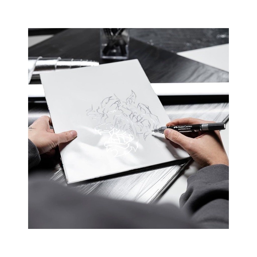 Obojstranný liehový popisovač FABER-CASTELL Multimark s dvoma hrotmi: tenký pevný pre detailnú prácu a silnejší okrúhly pre výrazné ťahy. Ideálny popisovač na použitie na takmer všetky povrchy, ako je papier, kov, drevo, keramika, sklo, kameň a textil. Vhodný na savé aj nesavé materiály. Vymeniteľné hroty umožňujú ľahkú údržbu a dlhodobo presné kreslenie. Popisovač vytvára chrómový zrkadlový efekt, ktorý vynikne na prianiach, ozdobách, skle a ďalších povrchoch.