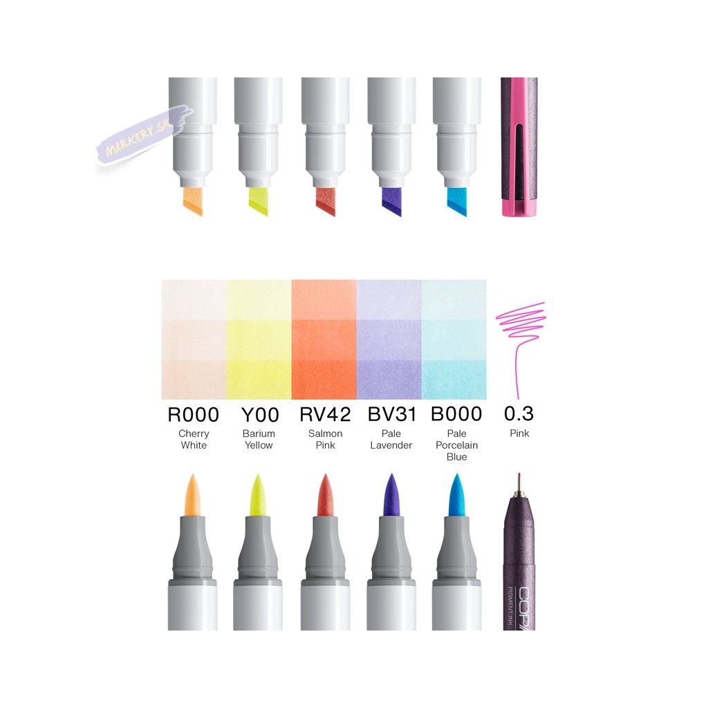 Sada obsahuje: R000, Y00, RV42, BV31, B000, Multiliner Pink 0,3mm