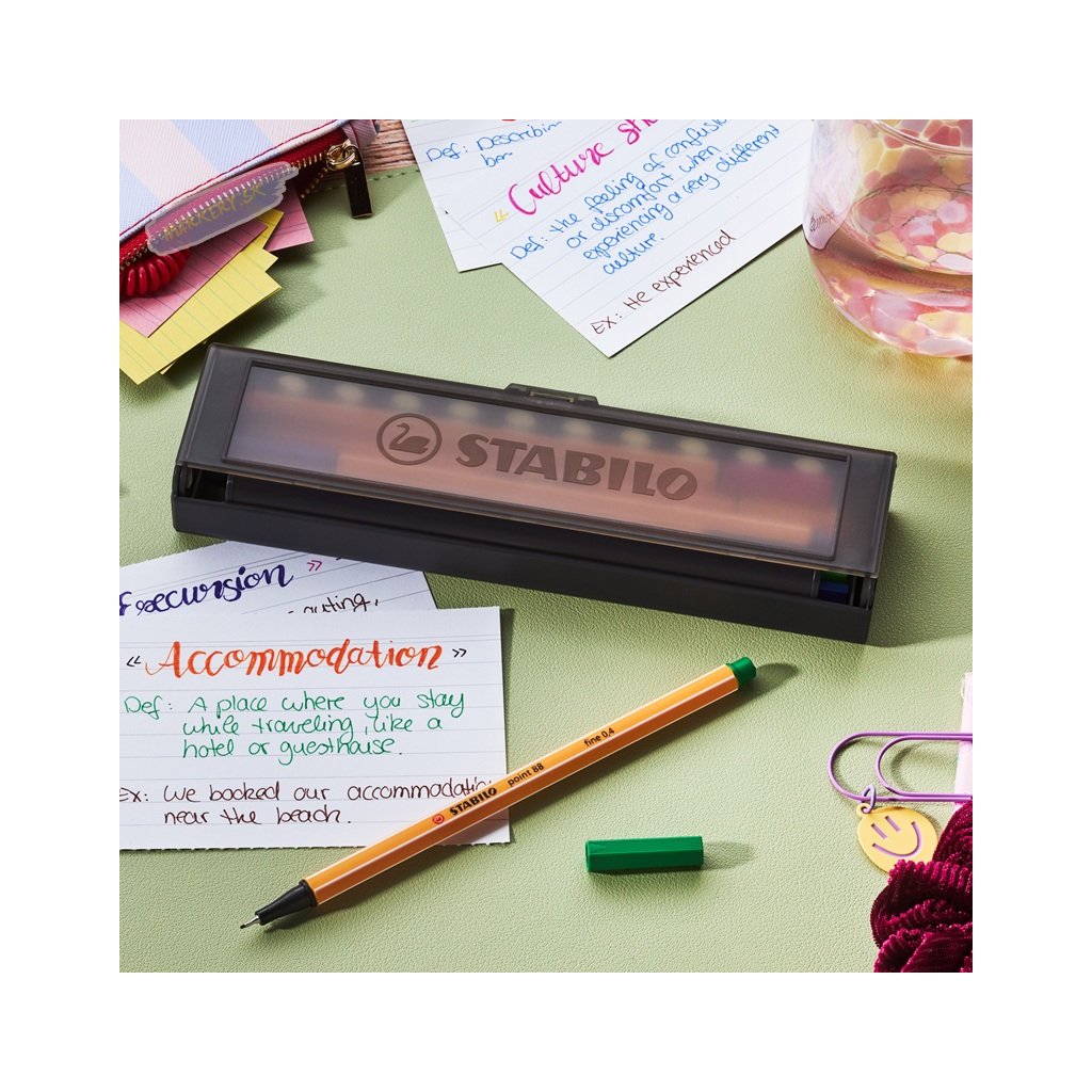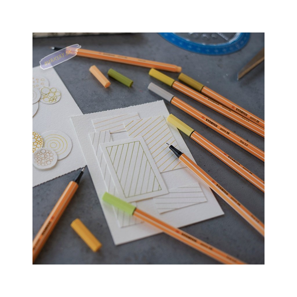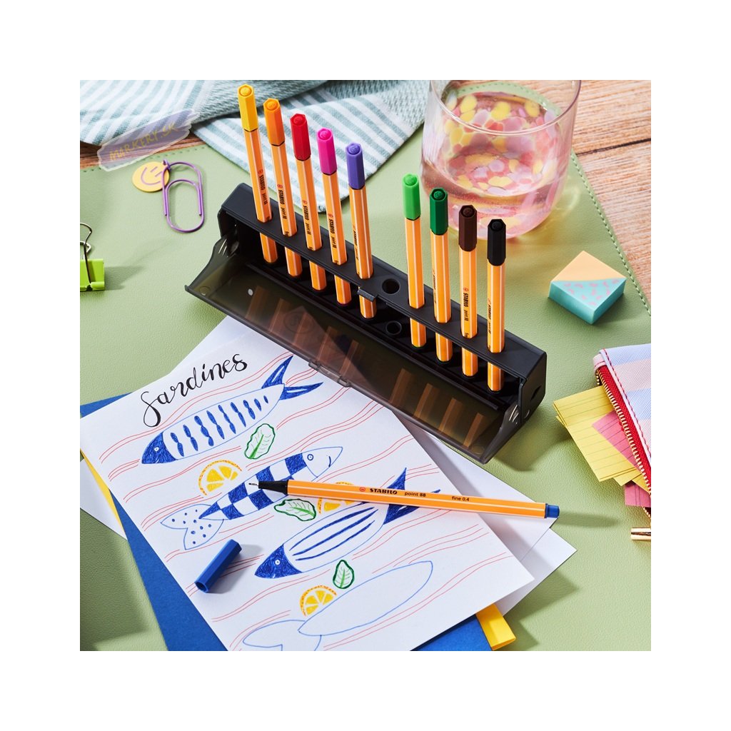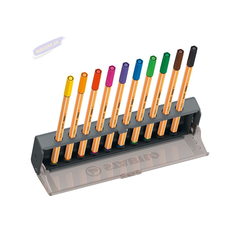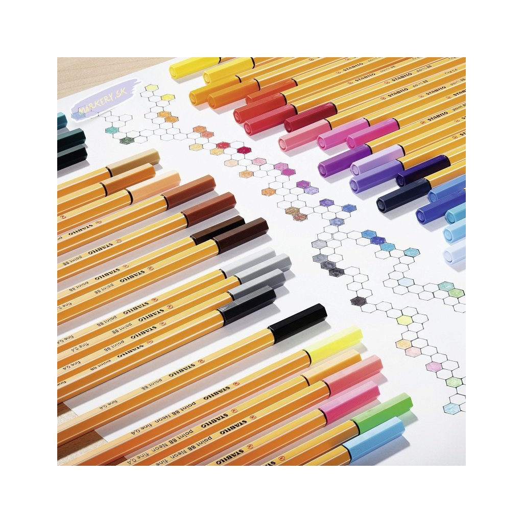STABILO Point 88 je perfektný pre deti, študentov aj profesionálov. Vyrába sa v nezmenenej podobe už od roku 1977 a ľudia po celom svete oceňujú jeho kvalitu a všestrannú použiteľnosť v každej situácii. Slávny šesťhranný tvar STABILO Point 88 s bielymi prúžkami na hranách sa veľmi príjemne drží. 65 farieb zaručí, že vždy nájdete ideálny odtieň, ktorý potrebujete. Pre žiarivejšie poznámky je v ponuke aj 6 neónových farieb. Dlhá životnosť a výdrž bez viečka zaručí, že sa nemusíte trápiť, keď ho náhodou zabudnete zavrieť. Šírka stopy 0,4mm poskytuje kontrolu a presnosť. Hrot v kovovom puzdre zaisťuje pevnosť a dlhú životnosť. Pri kreslení môžete vytvárať zložité detaily, pri písaní môžete písať naozaj malé písmenká. Je tiež vhodný pre prácu s pravítkom, šablónami a pre rysovanie. p>
