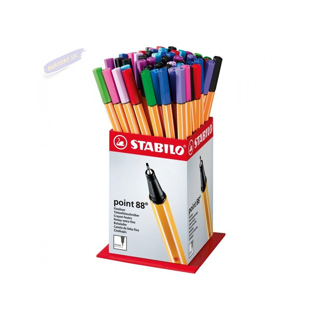 STABILO Point 88 je perfektný pre deti, študentov aj profesionálov. Vyrába sa v nezmenenej podobe už od roku 1977 a ľudia po celom svete oceňujú jeho kvalitu a všestrannú použiteľnosť v každej situácii. Slávny šesťhranný tvar STABILO Point 88 s bielymi prúžkami na hranách sa veľmi príjemne drží. 65 farieb zaručí, že vždy nájdete ideálny odtieň, ktorý potrebujete. Pre žiarivejšie poznámky je v ponuke aj 6 neónových farieb. Dlhá životnosť a výdrž bez viečka zaručí, že sa nemusíte trápiť, keď ho náhodou zabudnete zavrieť. Šírka stopy 0,4mm poskytuje kontrolu a presnosť. Hrot v kovovom puzdre zaisťuje pevnosť a dlhú životnosť. Pri kreslení môžete vytvárať zložité detaily, pri písaní môžete písať naozaj malé písmenká. Je tiež vhodný na prácu s pravítkom, šablónami a na rysovanie.