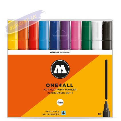 Pumpovacia akrylová fixka Molotow ONE4ALL je vybavená vymeniteľným hrotom a je k dispozícii až v 76 rôznych farbách a po vypísaní ju možno znovu naplniť atramentom. Vysoko krycí a permanentný atrament je odolný voči UV žiareniu a trvanlivý takmer na všetkých povrchoch. Je skonštruovaný tak, aby jeho popisovače šli znova naplniť a boli vždy spoľahlivé a funkčné. Či už maľujete na drevo, plátno, kov, stenu, sklo alebo textil – nič nie je nemožné. Individuálne farebné odtiene je možné ľahko namiešať vďaka náhradným atramentom. Efektové farby (fluorescenčné a metalické) robia vyfarbovanie ešte atraktívnejšie a nemali by chýbať v sortimente žiadneho umelca. Na zvýšenie odolnosti je vhodné použiť fixačné laky v mate alebo lesku. Molotow fixy sú vybavené patentovaným kapilárnym systémom, ktorý umožňuje plynulú distribúciu farby do hrotu a jej konštantné rozloženie.