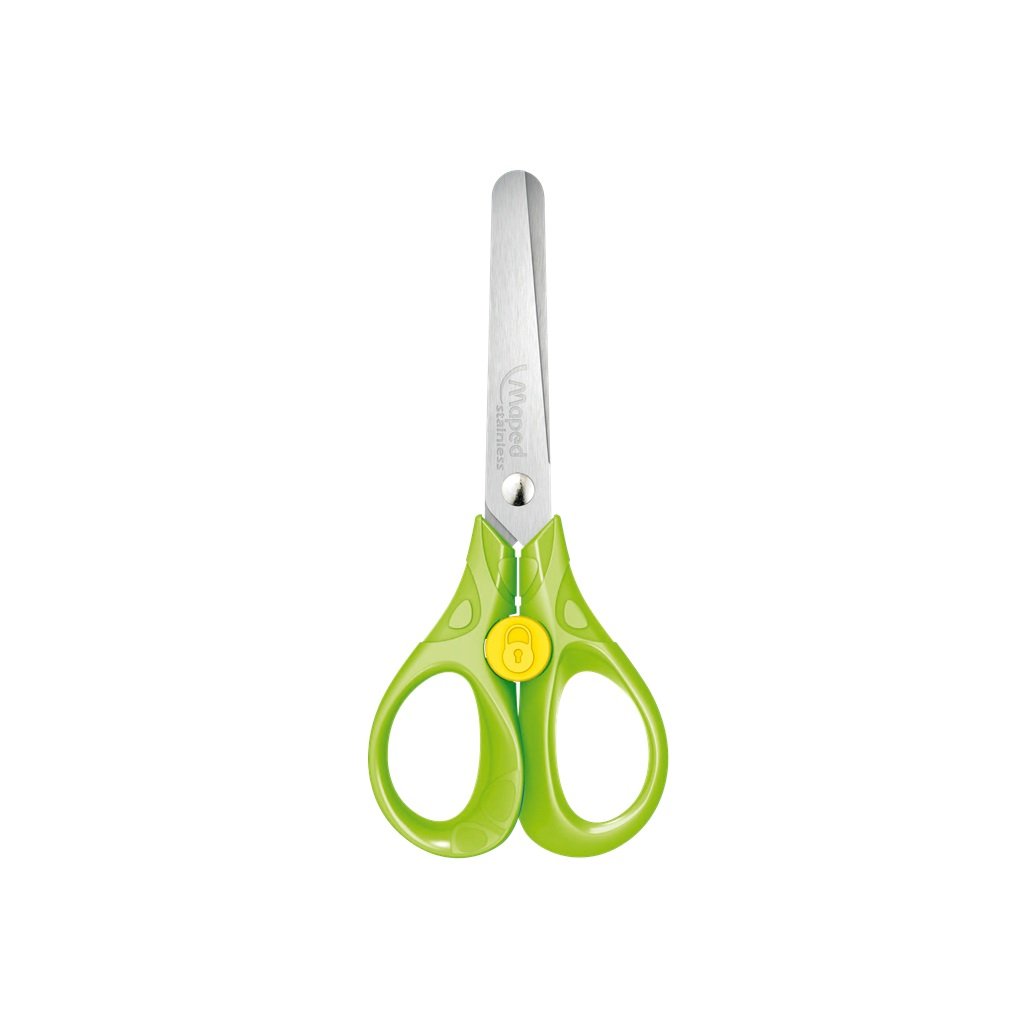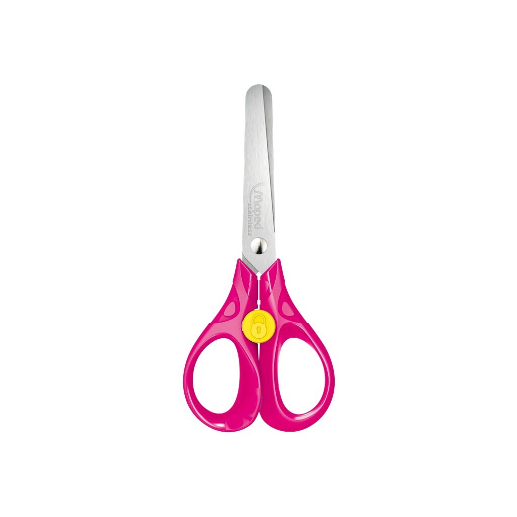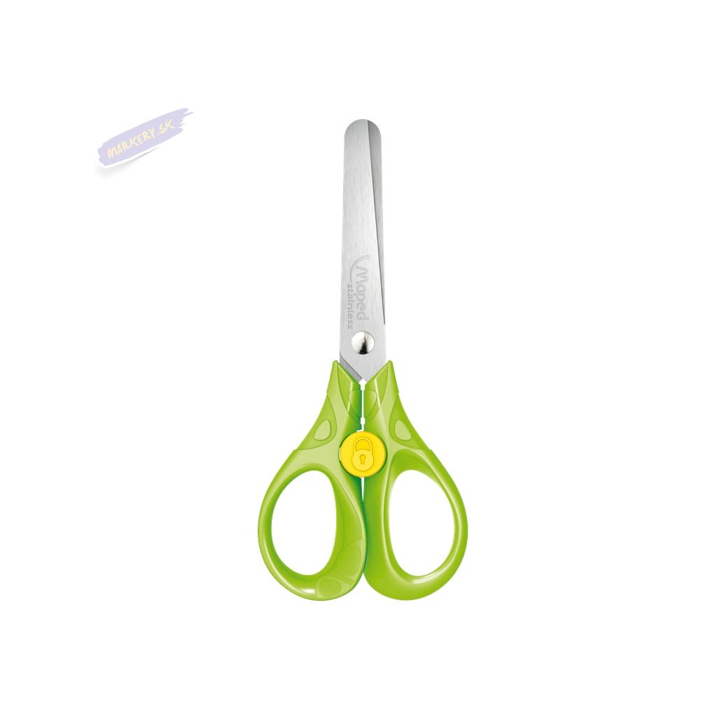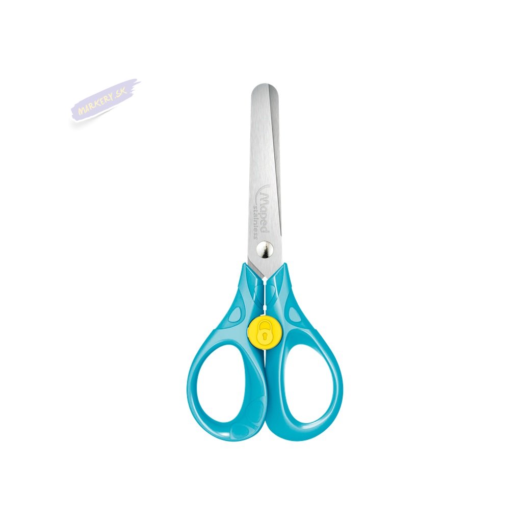Školské nožnice Maped Security, veľkosť 13 cm. Čepele z brúsenej nerezovej ocele, zaoblené špičky. Unikátny systém zabraňujúci nechcenému otvoreniu nožníc. Ergonomická rukoväť. Mix farieb.