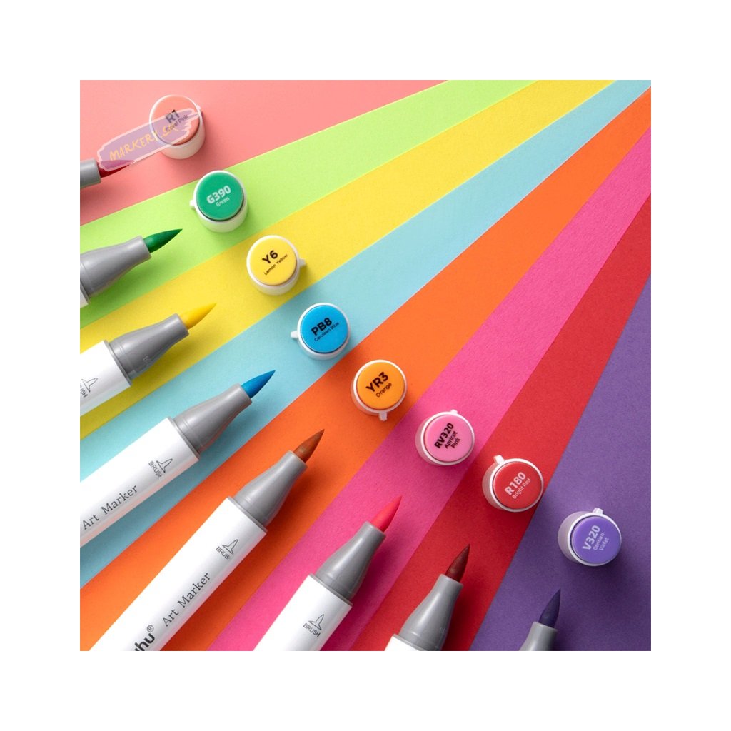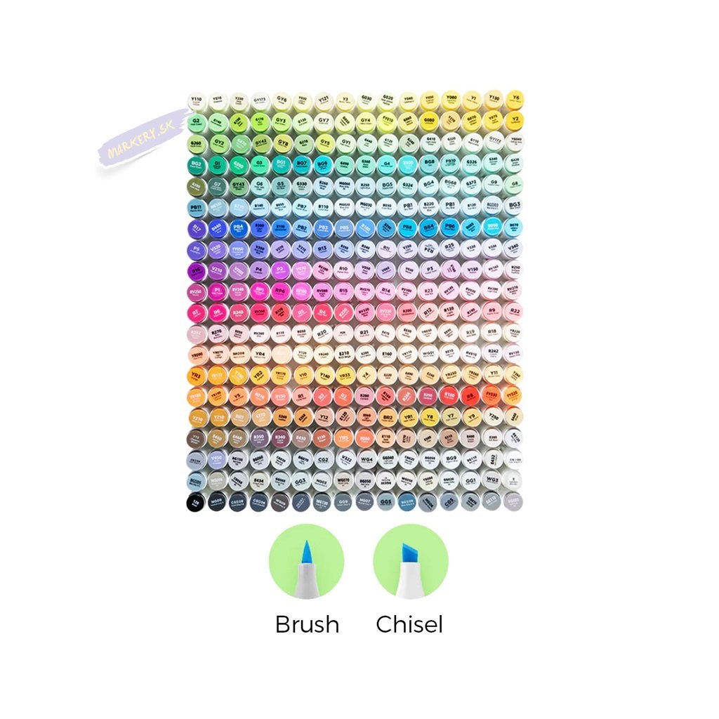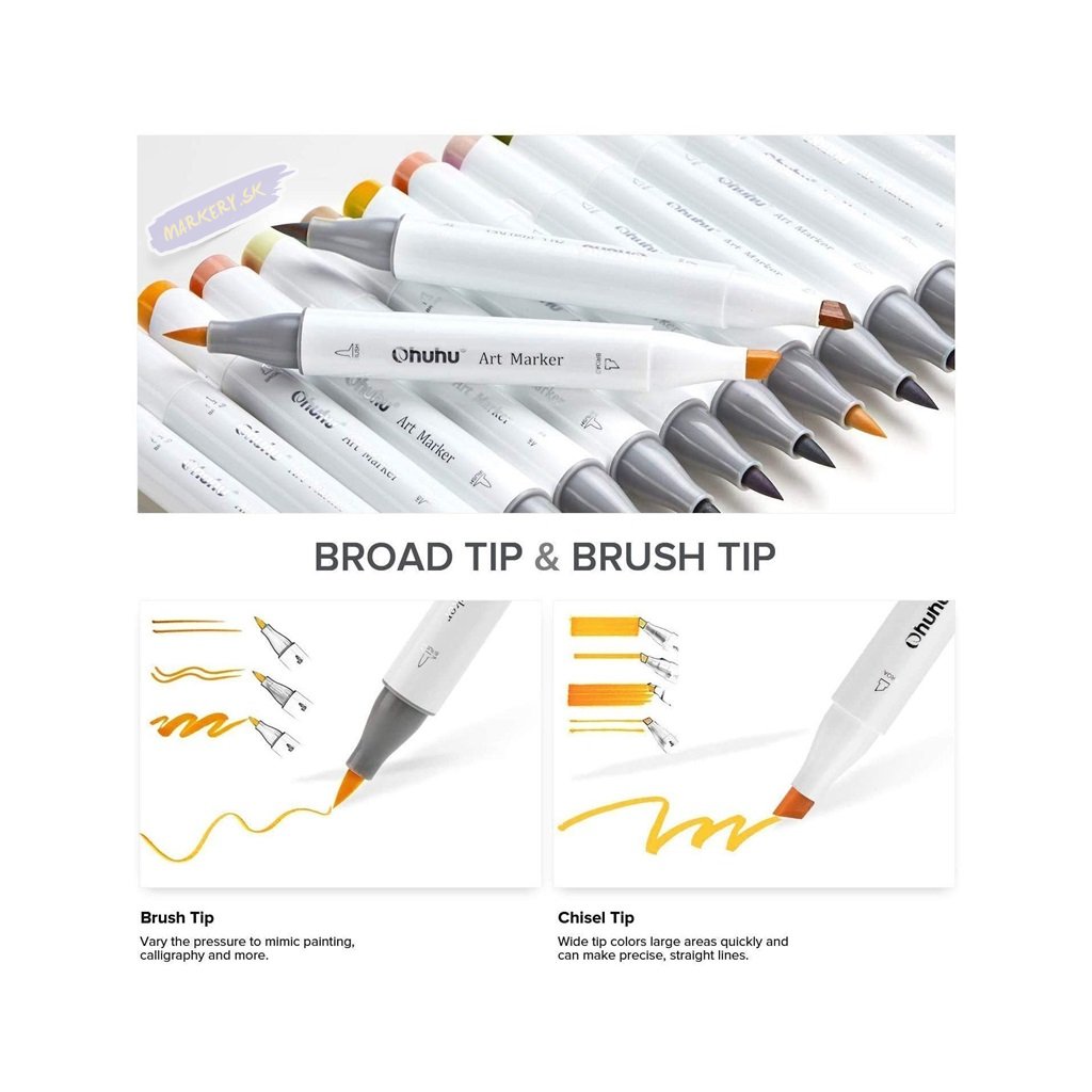 Obojstranné popisovače OHUHU na báze alkoholu so štetcovým hrotom na jednej strane a šikmým hrotom na strane druhej.
