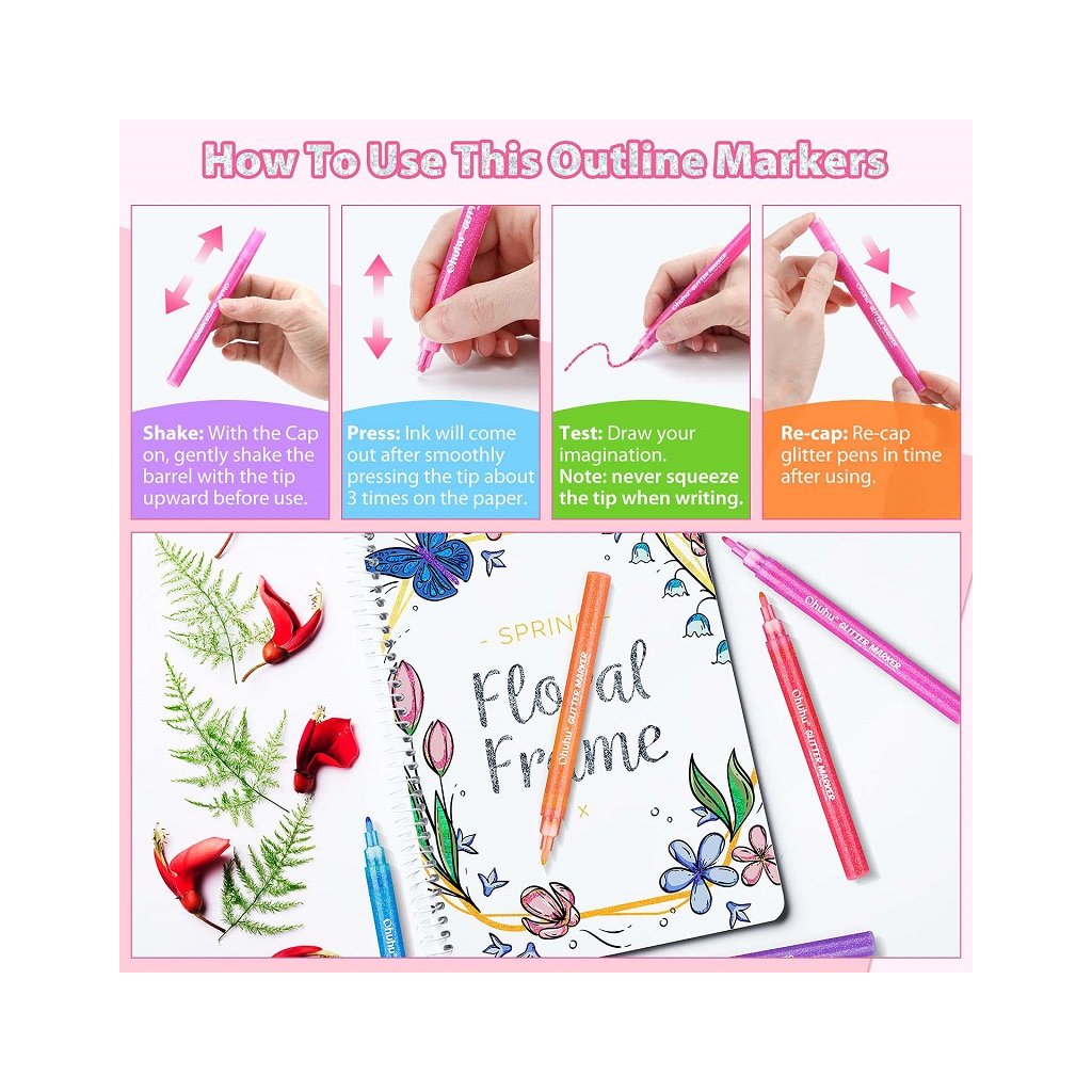 Pred použitím obrysové fixy pretrepte hrotom nahor s nasadeným uzáverom. Potom niekoľkokrát stlačte hrot na papier a môžete začať písať. Pri písaní je ideálne držať trblietavé fixky pod uhlom 45 stupňov, aby bol žiarivý efekt lepší a jasnejší.
