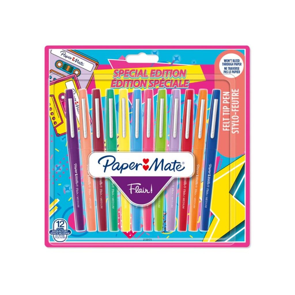 PAPER MATE Flair rozjasní Vašu tvorbu či už píšete, skicujete alebo dokonca maľujete. Rýchloschnúci atrament je odolný proti rozmazaniu a nebude na stránke presvitať. Fixky majú odolný kovom zosilnený plstený hrot, štýlový dizajn s matným povrchom a kovovou sponou.
