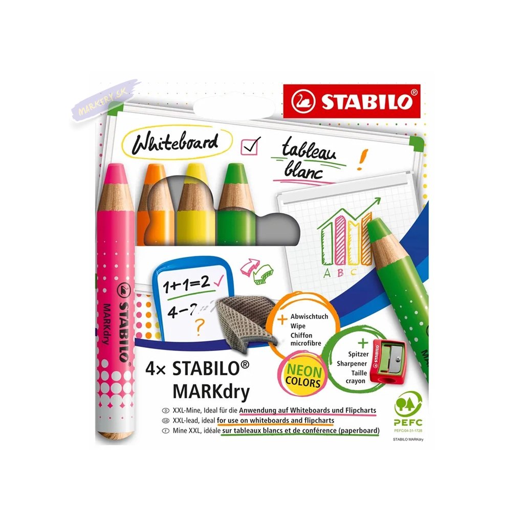Pastelky STABILO MARKdry na bielé tabule a flipchart, 4ks neón + príslušenstvo