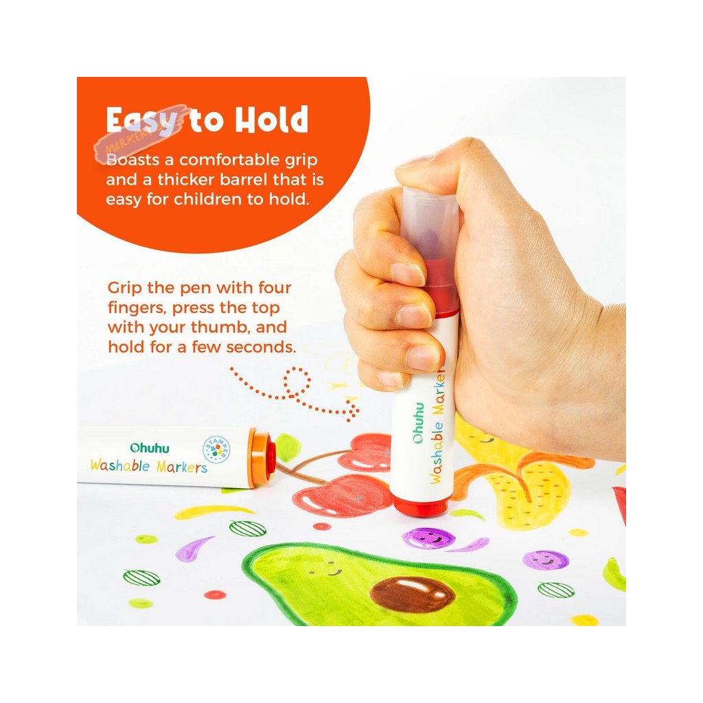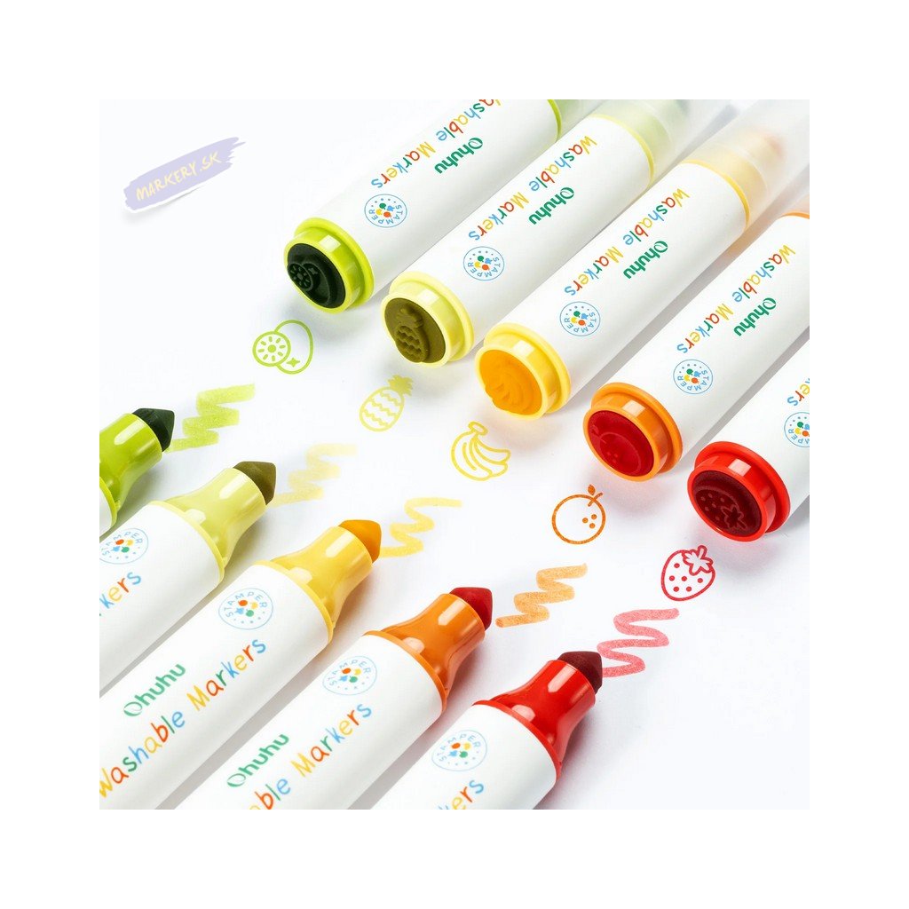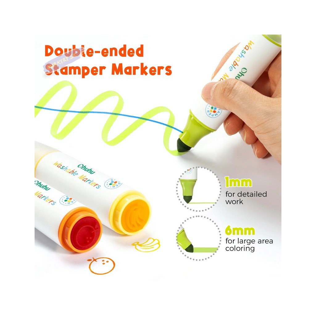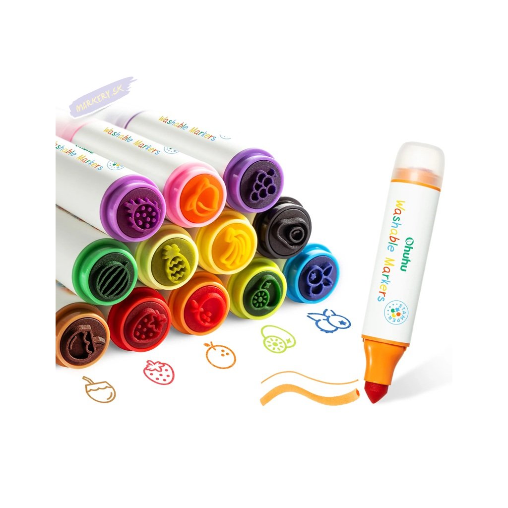 Kužeľovitý hrot detských fix OHUHU vytvára tenké linky aj vypĺňa veľké plochy výraznými a žiarivými farbami. Druhý koniec je opatrený okrúhlou pečiatkou, ktorá dodáva hravý nádych. Vyberte si z 12 roztomilých ovocných pečiatok, z ktorých každé zodpovedá prirodzenej farbe ovocia. Atrament na vodnej báze je bezpečný, netoxický a certifikovaný podľa ASTM-D4236, takže je ideálny pre tých najmenších umelcov. Nemusíte sa báť škvŕn – ak sa vášmu dieťaťu atrament dostane na stôl, oblečenie alebo kožu, ľahko sa zmyje vodou alebo jemným čistiacim prostriedkom.