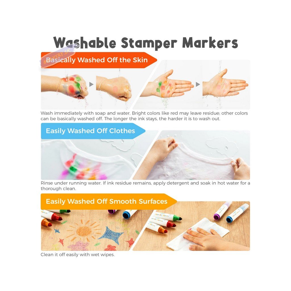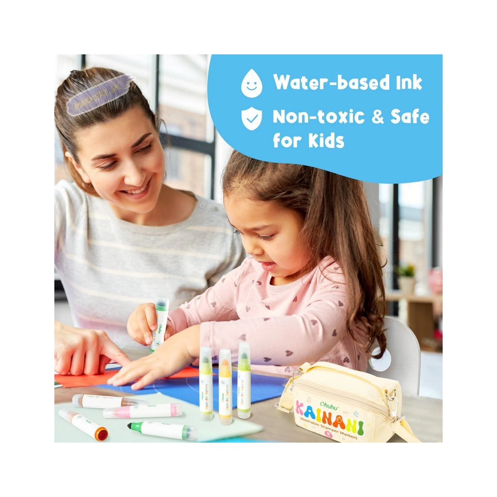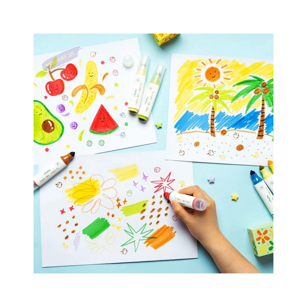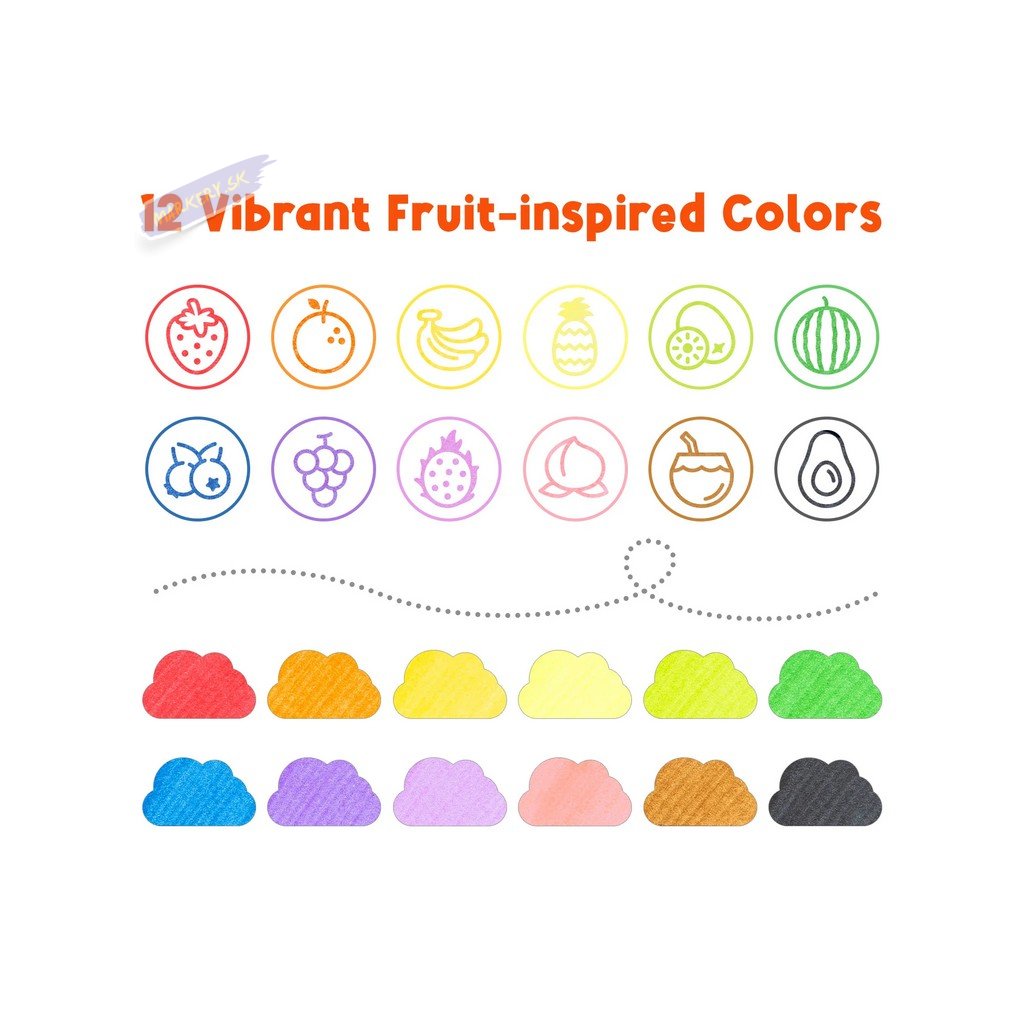 Kužeľovitý hrot detských fix OHUHU vytvára tenké linky aj vypĺňa veľké plochy výraznými a žiarivými farbami. Druhý koniec je opatrený okrúhlou pečiatkou, ktorá dodáva hravý nádych. Vyberte si z 12 roztomilých ovocných pečiatok, z ktorých každé zodpovedá prirodzenej farbe ovocia. Atrament na vodnej báze je bezpečný, netoxický a certifikovaný podľa ASTM-D4236, takže je ideálny pre tých najmenších umelcov. Nemusíte sa báť škvŕn – ak sa vášmu dieťaťu atrament dostane na stôl, oblečenie alebo kožu, ľahko sa zmyje vodou alebo jemným čistiacim prostriedkom.