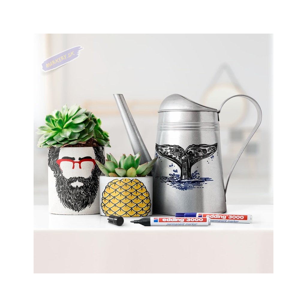 Permanentný popisovač Edding 3000, odolný voči rozmazaniu a opotrebovaniu, funguje takmer na všetky povrchy. Hodí sa do každej domácnosti na označovanie takmer všetkých materiálov, napr. kartón, plast, sklo, kov, drevo, koža. Je rýchloschnúci, s nízkym zápachom. Odolný proti vode, teplu a opotrebovaniu. Dodáva sa v dvadsiatich rôznych farbách. Doplniteľný je atramentom v čiernej, červenej, modrej, zelenej, žltej, oranžovej, hnedej, fialovej, ružovej a svetlo modrej farbe. Vhodné sú na to náplne: Edding T 25, Edding T 100 a Edding T 1000 a Edding MTK 25. K dispozícii sú náhradné hroty. Atrament bez pridaného toluénu a xylénu. Okrúhly hrot má šírku stopy 1,5-3 mm.