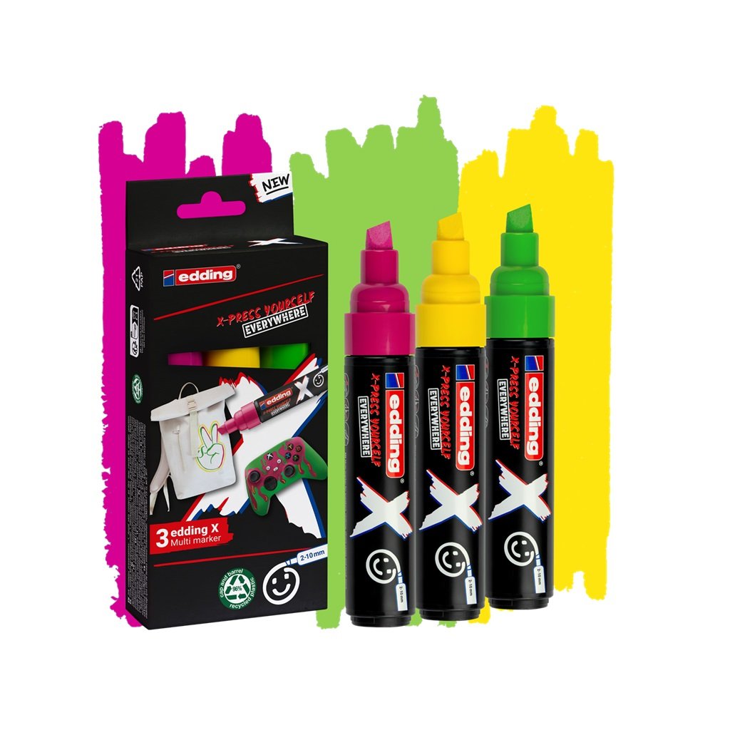 Všestranná fixka Edding Multimarker X je stvorená pre kreativitu všetkého druhu. Je ideálny na vyjadrenie vašej individuality na najrôznejších povrchoch, preto je to univerzálny parťák. Skosený hrot umožní nielen široké ťahy, ale vďaka jeho zrezanej špičke aj detailnú prácu. 96 % plastu použitého na viečko a telo popisovača je vyrobených z recyklovaného (PCR) plastu získaného triedením spotrebiteľského plastu. Vysoko kvalitný krycí atrament na báze vody je po zaschnutí permanentný, svetlostály a bez zápachu. Pred odstránením viečka popisovač dôkladne pretrepte, zapumpujte hrotom popisovača o podložku s papierom, kým hrot dostatočne nenasiakne atramentom. Skladujte vodorovne a pri izbovej teplote. Odolný šikmý hrot so šírkou stopy 2-10 mm je vymeniteľný.