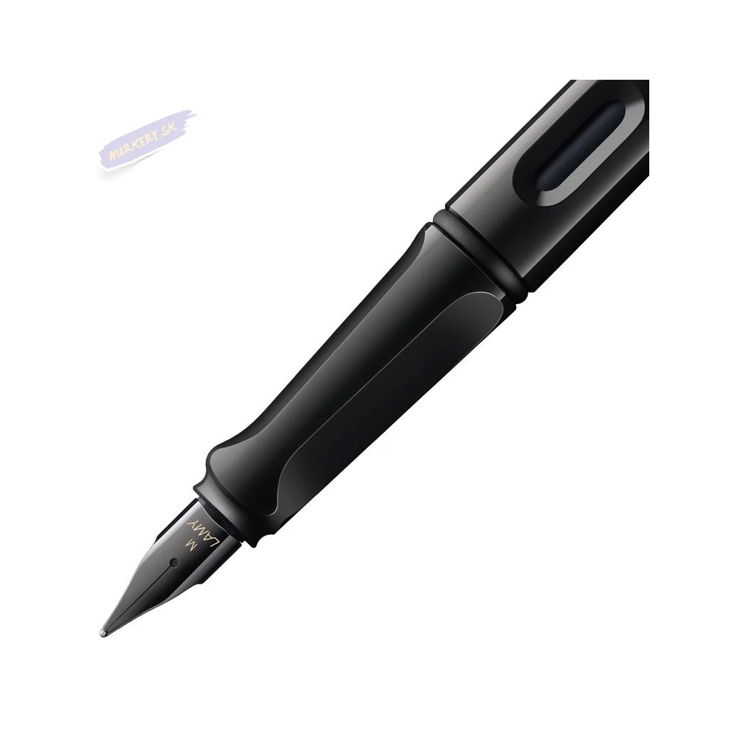 Plniace pero LAMY Safari All Black má telo z tvrdeného ABS plastu, nasadzovacie viečko a odpružený kovový klip. Úchopová zóna je ergonomicky upravená. Hrot je z nerezovej ocele. Charakteristickým prvkom tohto pera je ozdobný detail v podobe farebných krúžkov umiestnených na hornej časti viečka.