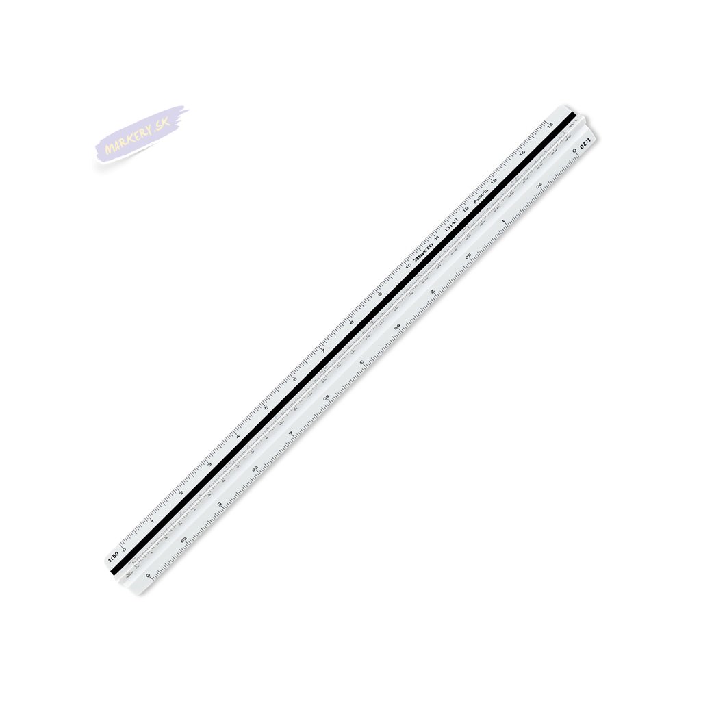 Pomerové trojuholníkové pravítko ARISTO s dĺžkou 30 cm, 3 farebné drážky pomáhajú rýchlejšie vybrať potrebný pomer: 1:15, 1:20, 1:25, 1:33, 1:50 a 1:100.