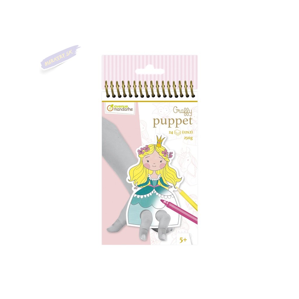 Omaľovánkové bábky AVENUE MANDARINE Graffy Puppet s rôznymi motívmi. Vopred pripravené a upravené na následné použitie ako prstové bábky. Omaľovánky obsahujú 24 listov, 12 rozprávkových motívov po 2ks. Gramáž 250g. Možno použiť na všetky techniky - pastelky, fixky, akvarel atď. Rozmery balenia: 10x20cm.