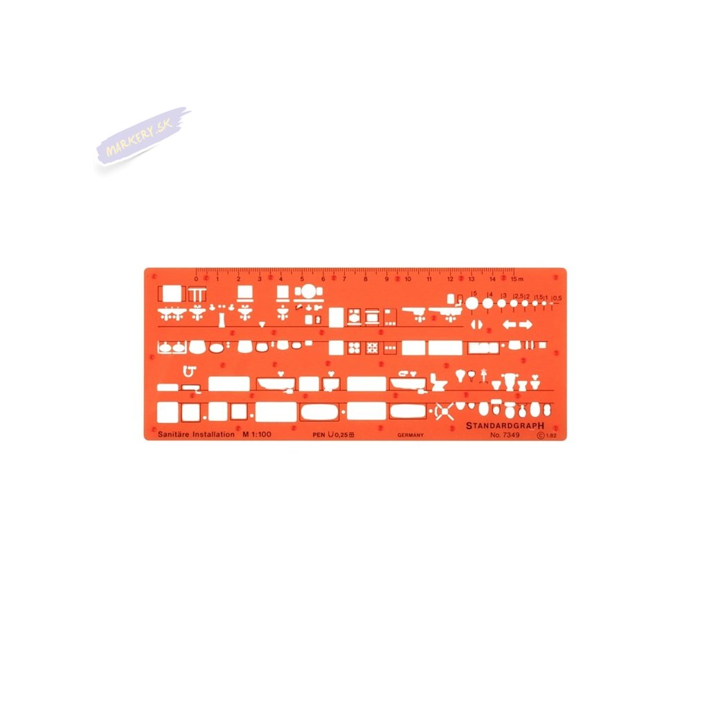 Šablóna Graph'It z ohybného a priehľadného plastu pre ľahké kreslenie sanitárnych prvkov. Šablóna obsahuje 104 tvarov v mierke 1:100.