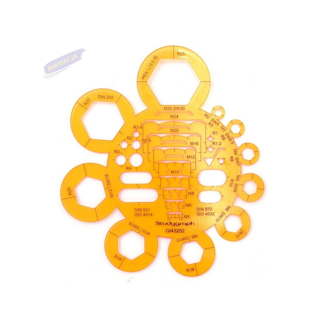 Šablóna Graph'It z ohybného a priehľadného plastu pre ľahké kreslenie matíc. Šablóna obsahuje 35 tvarov matíc a skrutiek.