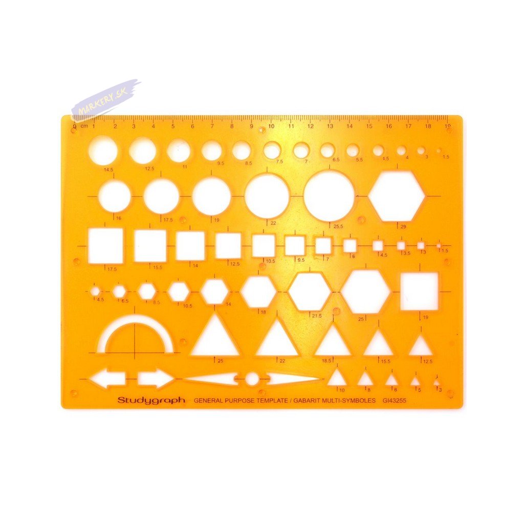 Šablóna Graph'It z ohybného a priehľadného plastu pre ľahké kreslenie symbolov. Šablóna obsahuje 56 rôznych tvarov. Pravítko na okrajoch v cm.