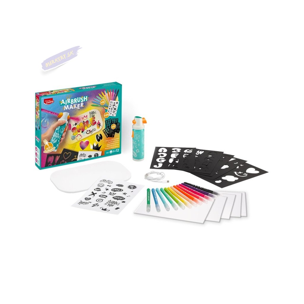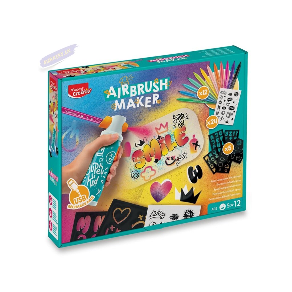 Kreatívna sada MAPED Creativ AirBrush Maker umožňuje deťom tvoriť žiarivé a originálne umelecké diela pomocou elektronického spreja a fixiek MAPED Color Peps Jungle. Súčasťou balenia sú aj šablóny a samolepky, ktoré podporujú detskú fantáziu. Jasné farby a dizajn inšpirovaný graffiti premení každú kresbu na moderný umelecký kúsok. AirBrush Maker zaisťuje rovnomerné nanášanie farby. Zariadenie je bezpečné, ľahko ovládateľné a nabíja sa prostredníctvom univerzálneho kábla USB-C, ktorý je súčasťou balenia. Počas nabíjania svieti kontrolka červeno a po úplnom nabití (cca 2 hodiny) sa rozsvieti modro. Plne nabitý AirBrush Maker poskytuje minimálne 80 minút nepretržitého používania. Vhodné pre deti od 5 rokov.