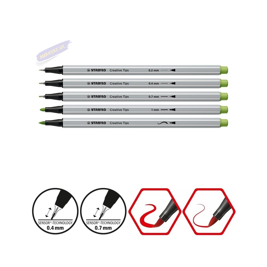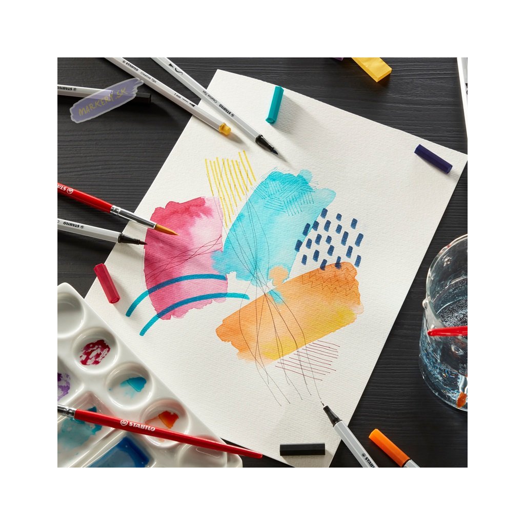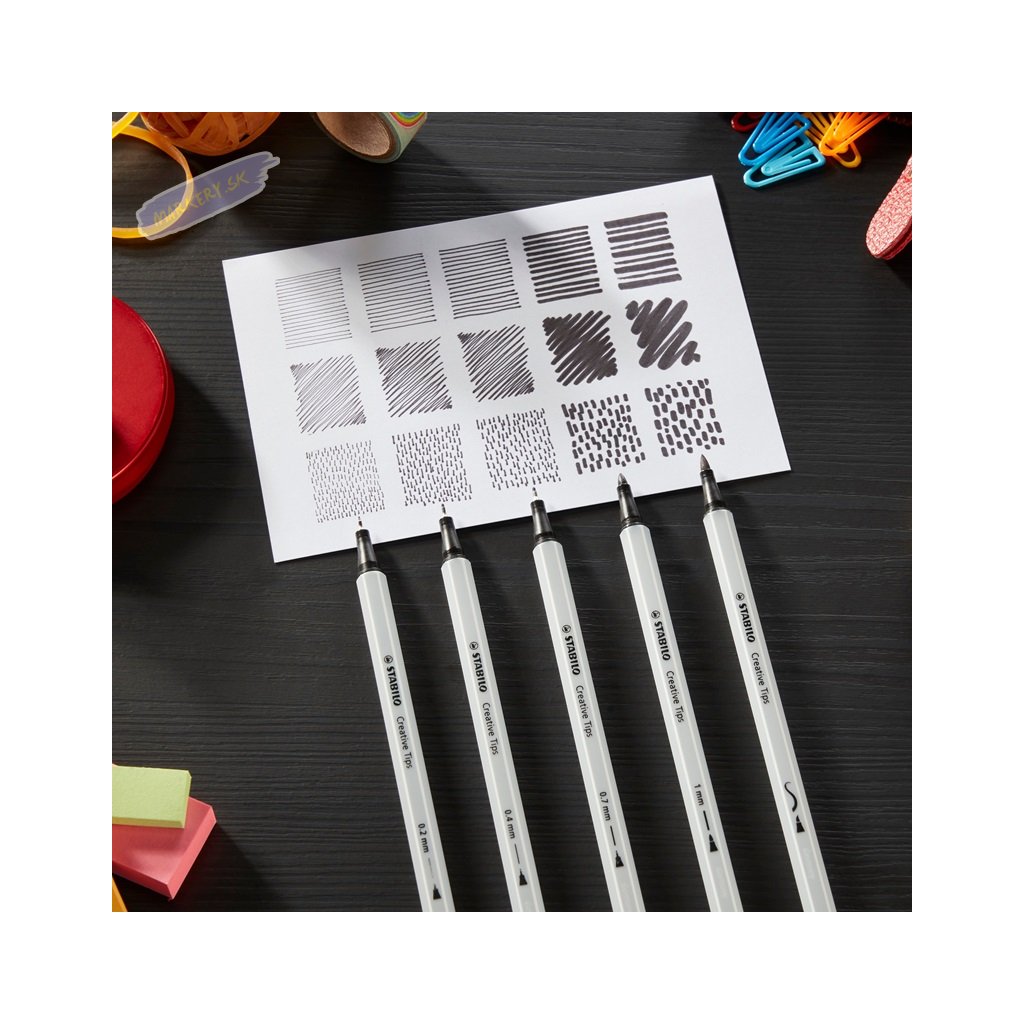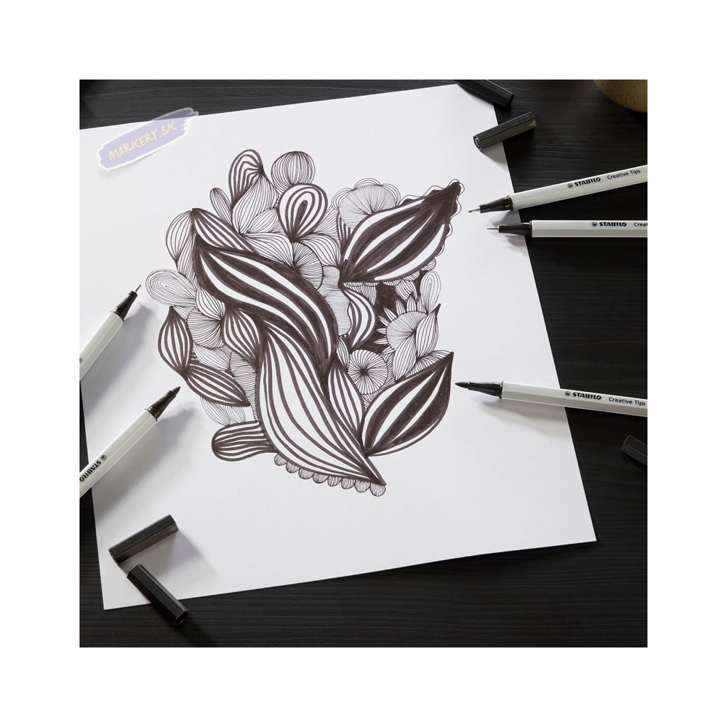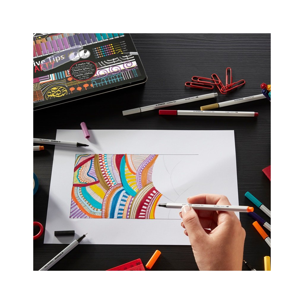 Sady STABILO Creative Tips je možné používať rôznymi kreatívnymi spôsobmi vďaka rôznym šírkam stôp a hrotom. Či už ide o prepracované monochromatické umelecké dielo alebo farebné nápisy, vysoko kvalitné linery a fixky sú perfektnými nástrojmi pre všetky druhy kreatívnych malieb. Zahŕňajú extra jemnú linku 0,2 mm a dve jemné linky s odpruženými hrotmi so šírkou stopy 0,4 mm a 0,7 mm, robustnú fixku so šírkou stopy 1 mm a fixku s flexibilným štetcovým hrotom. Prémiový výber piatich veľkostí hrotu je k dispozícii v rôznych sadách s rôznymi farebnými kombináciami. Atrament všetkých linerov a fixiek je na vodnej báze a je možné ich vodou rozmývať, čo umožňuje vytvárať dych vyrážajúce efekty a farebné prechody. Rad STABILO ARTY je pre všetkých kreatívnych ľudí, ktorí milujú čo najpestrejšie kreatívne vyjadrenia – či už sú to začiatočníci, pokročilí alebo profesionáli. Objavte veľký výber produktov s rôznymi hrotmi od extra tenkého hrotu po štetcový hrot.