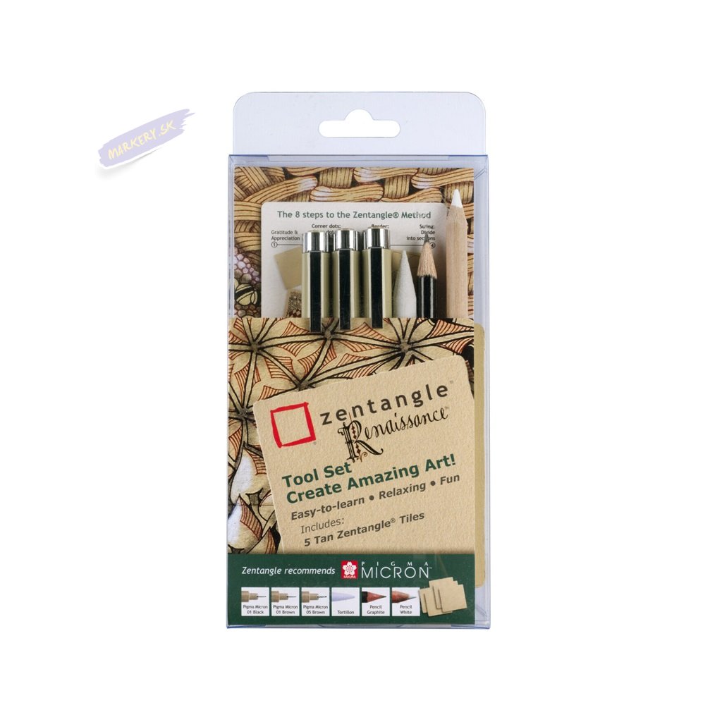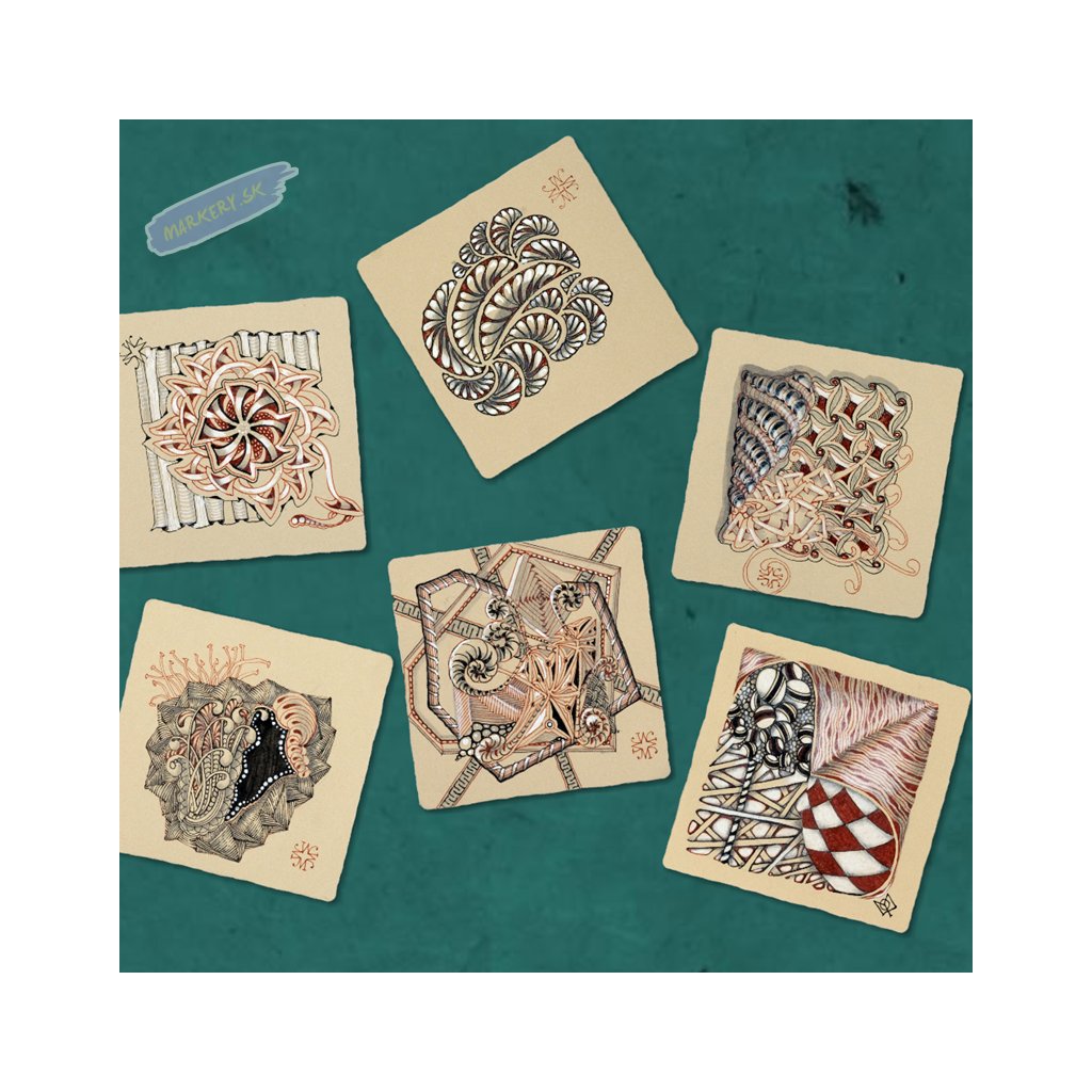 Sada obsahuje: PIGMA MICRON čierny 0,25mm + hnedý 0,25mm / 0,45mm + grafitová ceruzka BRUYNZEEL + biela uhlová ceruzka BRUYNZEEL + roztieradlo BRUYNZEEL + 5x špeciálna kartička ZENTANGLE 89x89mm