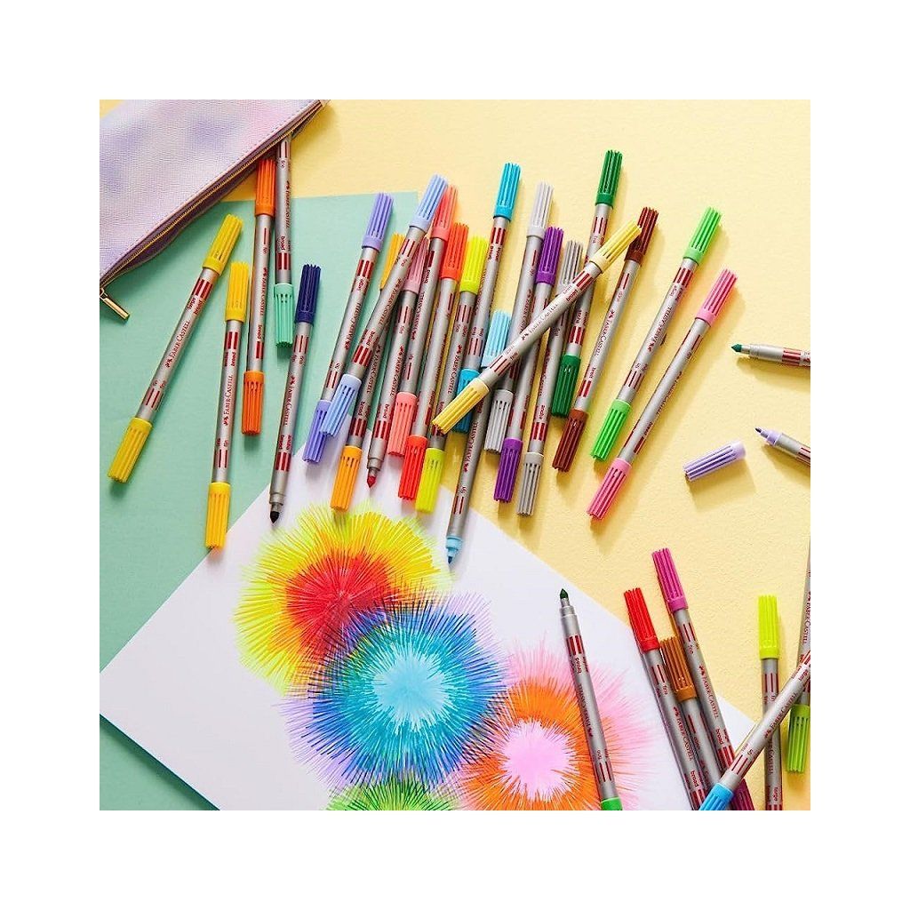 Súprava kvalitných obojstranných fixiek Faber-Castell Glitter s trblietavými farbami. Fixa má z každej strany rôznu šírku hrotu – podporuje kreativitu a ponúka neobmedzené možnosti vyfarbovania.