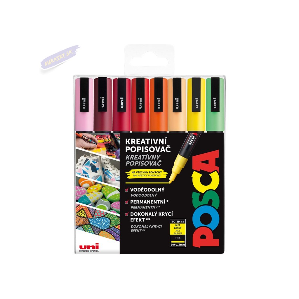Nepostrádateľný akrylový popisovač UNI POSCA je obľúbený ako profesionálmi, tak aj začiatočníkmi. Obsahuje jedinečný akrylový atrament, ktorého zloženie sa od svojho vytvorenia nezmenilo, je mimoriadne bohatý na pigmenty a je extrémne odolný voči atmosférickým podmienkam a plynutiu času. Jeho matné farby majú veľkú sýtosť - umelci ich milujú pre svoje diela a fanúšikovia sú ohromení „magickým“ efektom Posca. Obsahuje jedinečný ventilový mechanizmus, ktorý zaručuje perfektné utesnenie a šetrí farbu v priebehu času. Rovnaký mechanizmus sa používa na naplnenie popisovačov Posca na použitie a na opätovné nasýtenie hrotu tak často, ako je to nutné počas tvorenia. Farby sú vrstviteľné, miešateľné, vodou rozpustné, odolné voči poveternostným vplyvom a ponúkajú neobmedzené kreatívne možnosti.